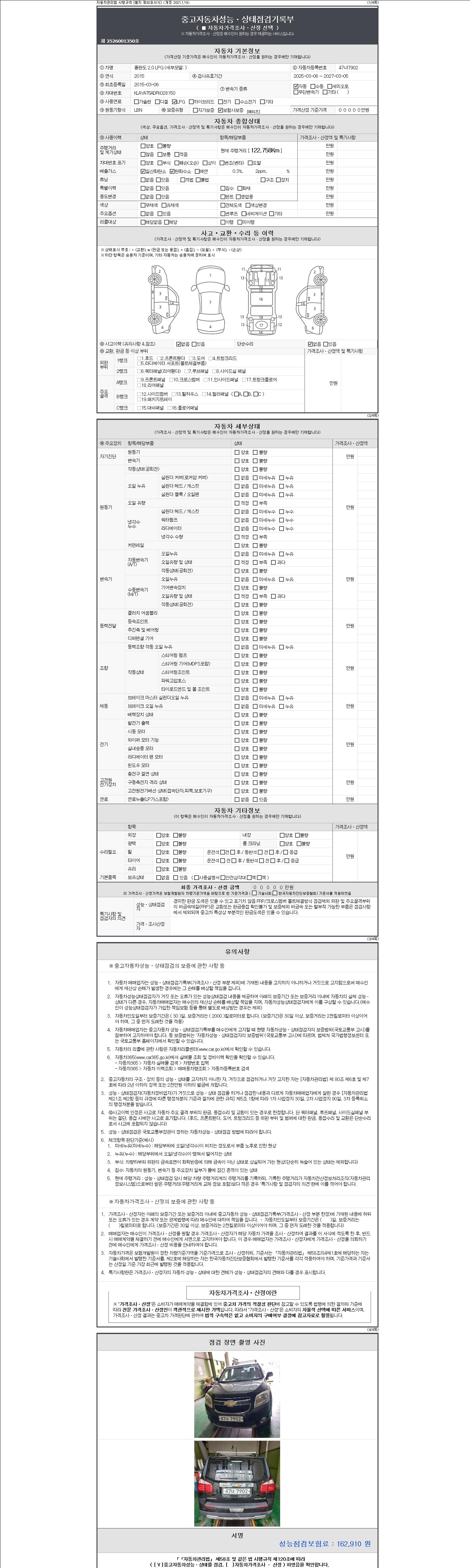 자동차관리법 시행규칙 제120조의 규정에 따라 별지 제 82호서식 《중고자동차 성능, 상태점검 기록부》를 발행한 성능, 상태점검자 및 매매자는 아래의 보증기간 또는 보증거리 이내의 중고자동차, 성능점검 기록부에 기재된 내용과 자동차의 실제 성능, 상태가 다른 경우 계약 또는 관계법령에 따라 매수인에 대하여 책임을 집니다.