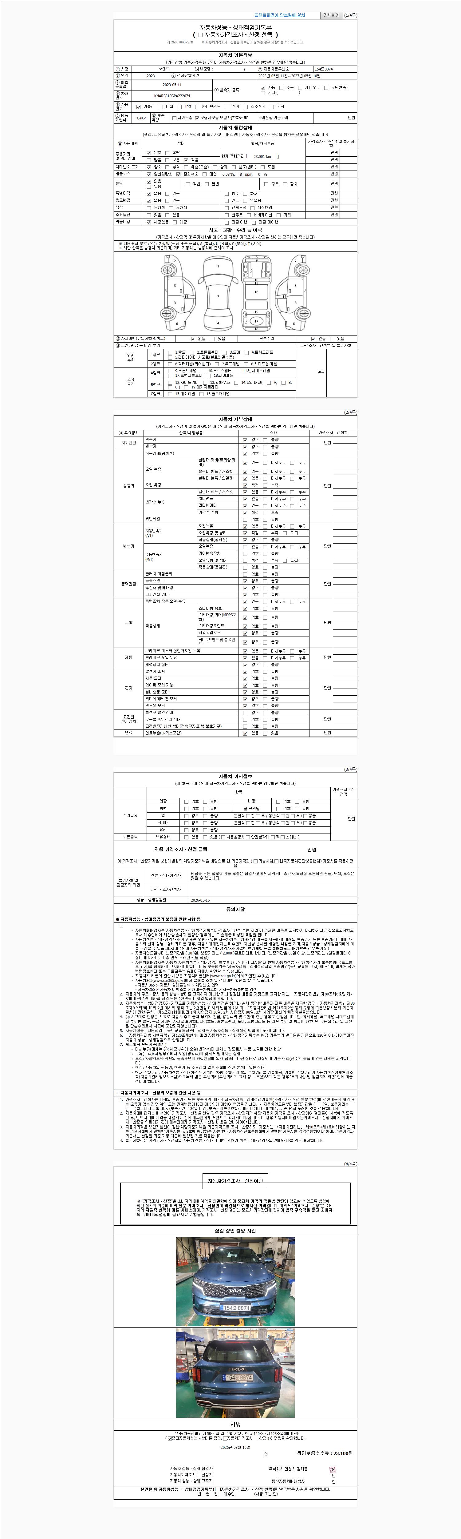 | 주행거리 | 23,001 km | 차량번호 | 154모8874 | 사고유무 | 성능기록부 참조 | 제시번호 | 제 2026013584 호 |