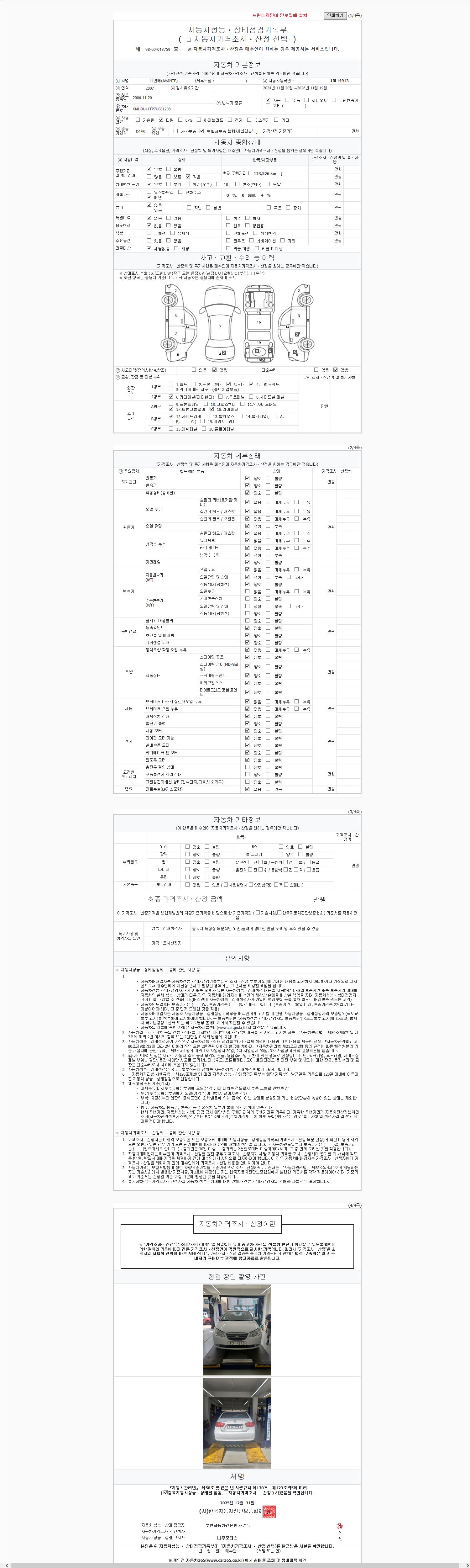 | 주행거리 | 123,500 km | 차량번호 | 10나4913 | 사고유무 | 성능기록부 참조 | 제시번호 | 제 2025163257 호 |