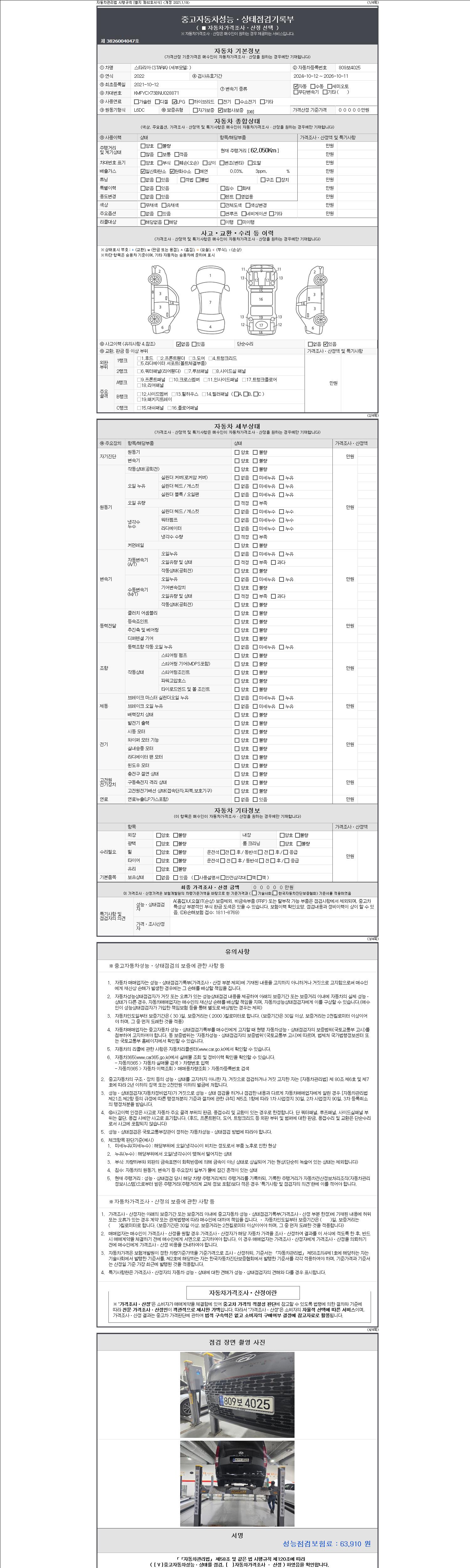 자동차관리법 시행규칙 제120조의 규정에 따라 별지 제 82호서식 《중고자동차 성능, 상태점검 기록부》를 발행한 성능, 상태점검자 및 매매자는 아래의 보증기간 또는 보증거리 이내의 중고자동차, 성능점검 기록부에 기재된 내용과 자동차의 실제 성능, 상태가 다른 경우 계약 또는 관계법령에 따라 매수인에 대하여 책임을 집니다.