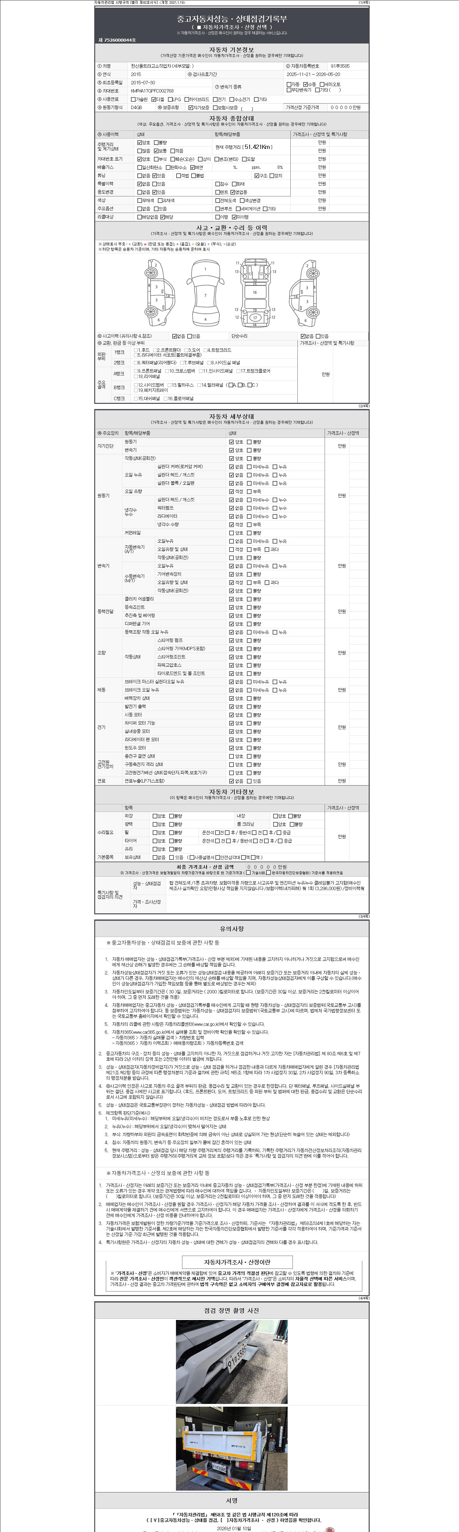 자동차관리법 시행규칙 제120조의 규정에 따라 별지 제 82호서식 《중고자동차 성능, 상태점검 기록부》를 발행한 성능, 상태점검자 및 매매자는 아래의 보증기간 또는 보증거리 이내의 중고자동차, 성능점검 기록부에 기재된 내용과 자동차의 실제 성능, 상태가 다른 경우 계약 또는 관계법령에 따라 매수인에 대하여 책임을 집니다.