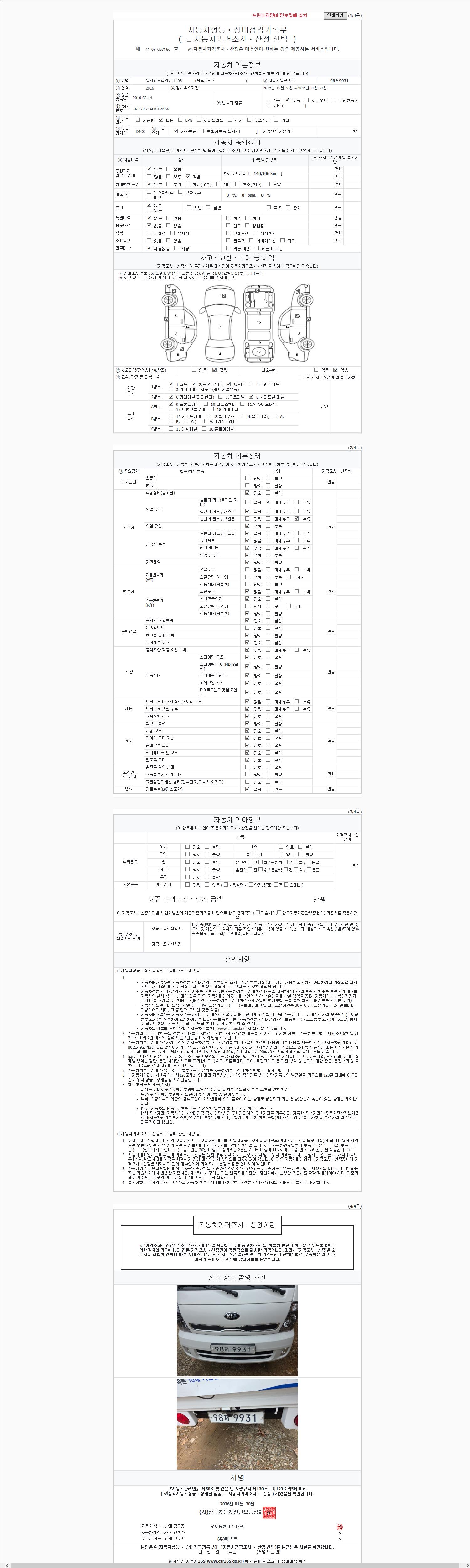 | 주행거리 | 140,045 km | 차량번호 | 98저9931 | 사고유무 | 성능기록부 참조 | 제시번호 | 제 2147483647 호 |