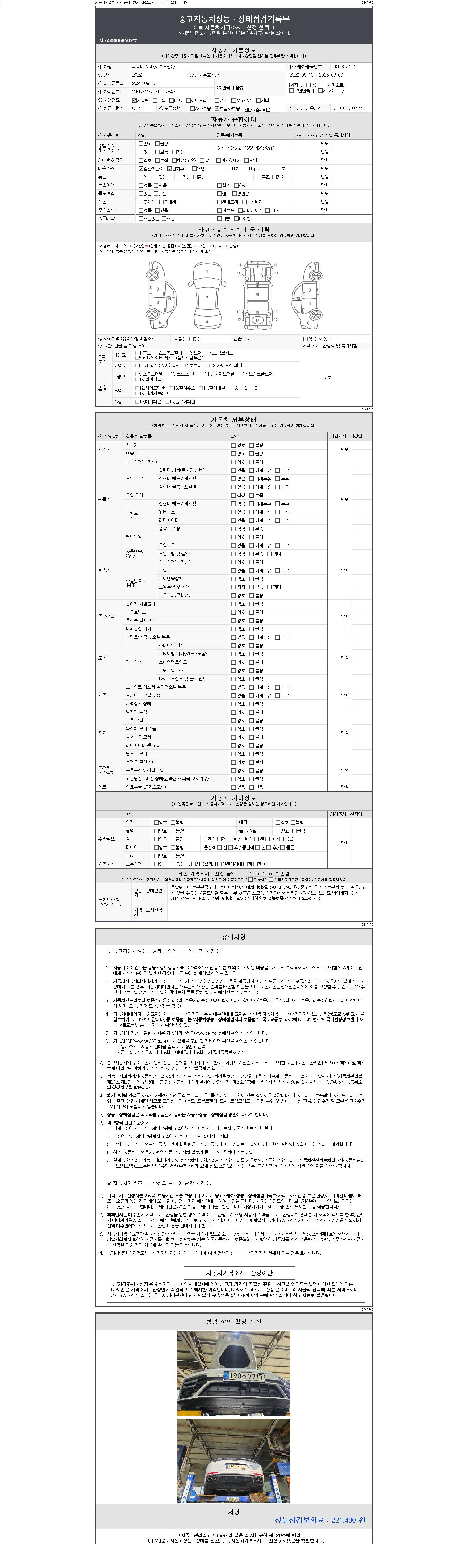 | 주행거리 | 22,423 km | 차량번호 | 190조7717 | 사고유무 | 성능기록부 참조 | 제시번호 | 제 2147483647 호 |