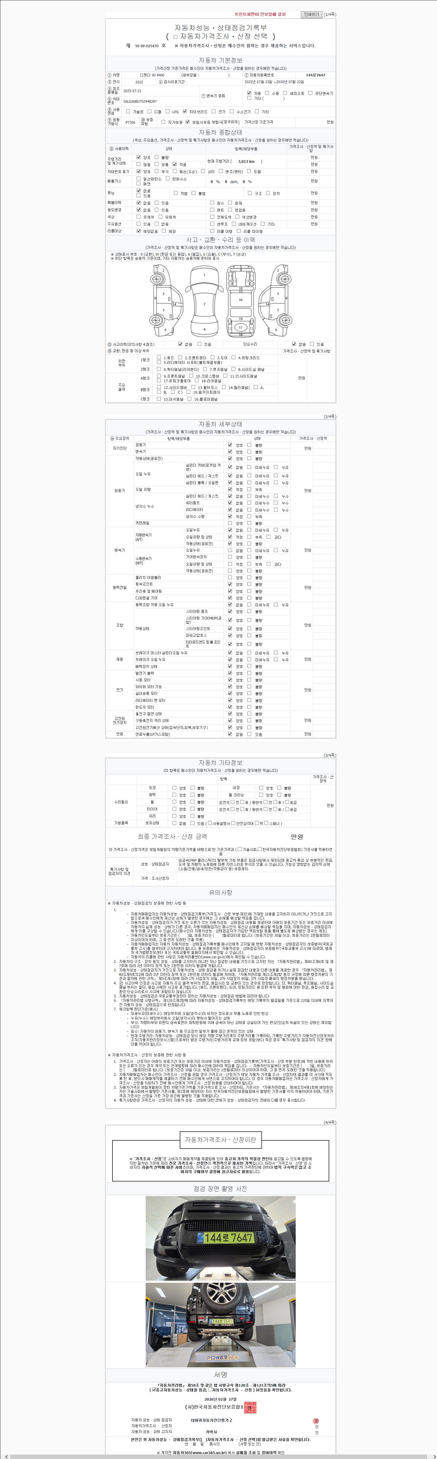 | 주행거리 | 3,013 km | 차량번호 | 144로7647 | 사고유무 | 성능기록부 참조 | 제시번호 | 제 2147483647 호 |