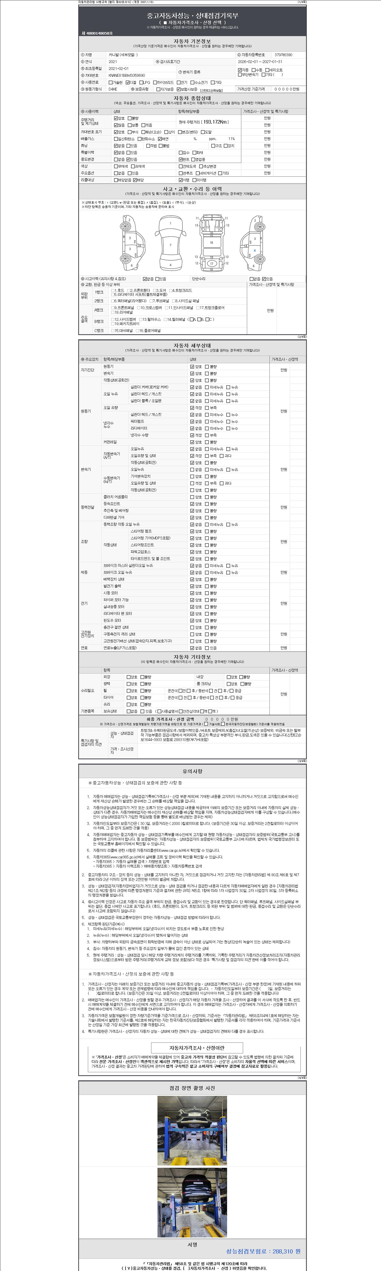 자동차관리법 시행규칙 제120조의 규정에 따라 별지 제 82호서식 《중고자동차 성능, 상태점검 기록부》를 발행한 성능, 상태점검자 및 매매자는 아래의 보증기간 또는 보증거리 이내의 중고자동차, 성능점검 기록부에 기재된 내용과 자동차의 실제 성능, 상태가 다른 경우 계약 또는 관계법령에 따라 매수인에 대하여 책임을 집니다.