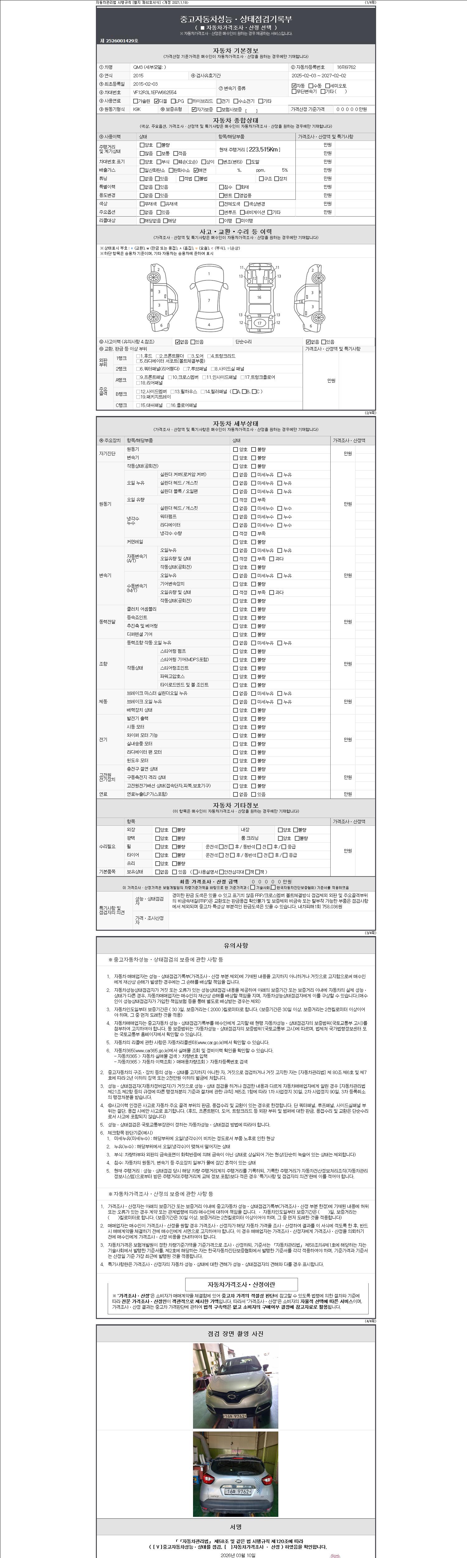 -중고자동차 매매업자를 통해 차량을 구입하실 경우 반드시 "중고자동차 성능, 상태점검 기록부"를 교뷰 받으셔야 하며, 매매업자는 반드시 의무 교부 하여야 압니다.