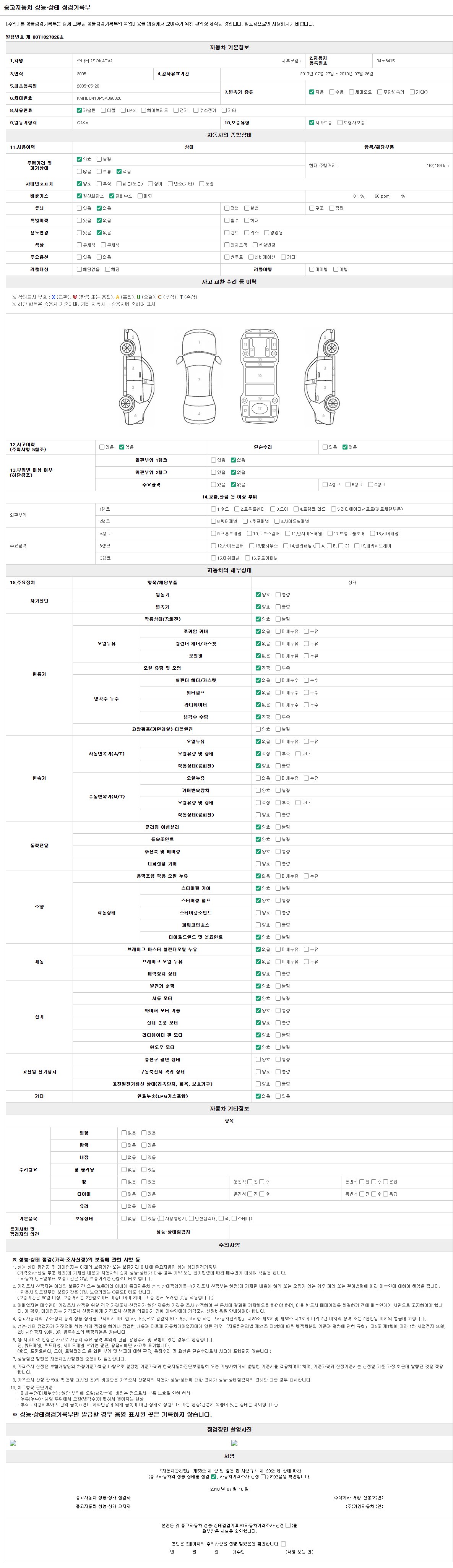 자동차관리법 시행규칙 제120조의 규정에 따라 별지 제 82호서식 《중고자동차 성능, 상태점검 기록부》를 발행한 성능, 상태점검자 및 매매자는 아래의 보증기간 또는 보증거리 이내의 중고자동차, 성능점검 기록부에 기재된 내용과 자동차의 실제 성능, 상태가 다른 경우 계약 또는 관계법령에 따라 매수인에 대하여 책임을 집니다.