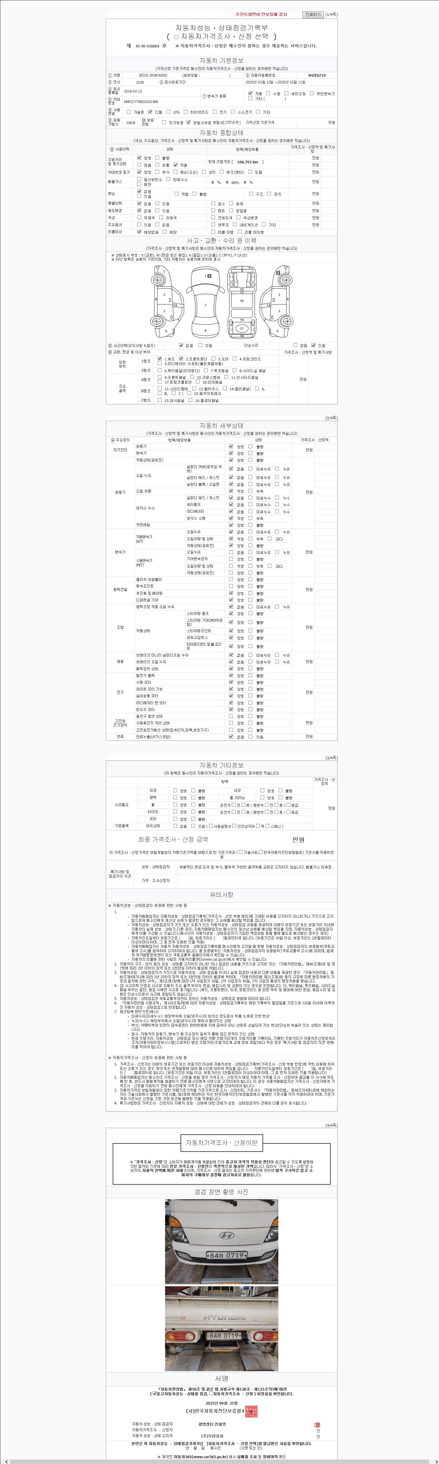 | 주행거리 | 108,792 km | 차량번호 | 84러0719 | 사고유무 | 성능기록부 참조 | 제시번호 | 제 2147483647 호 |