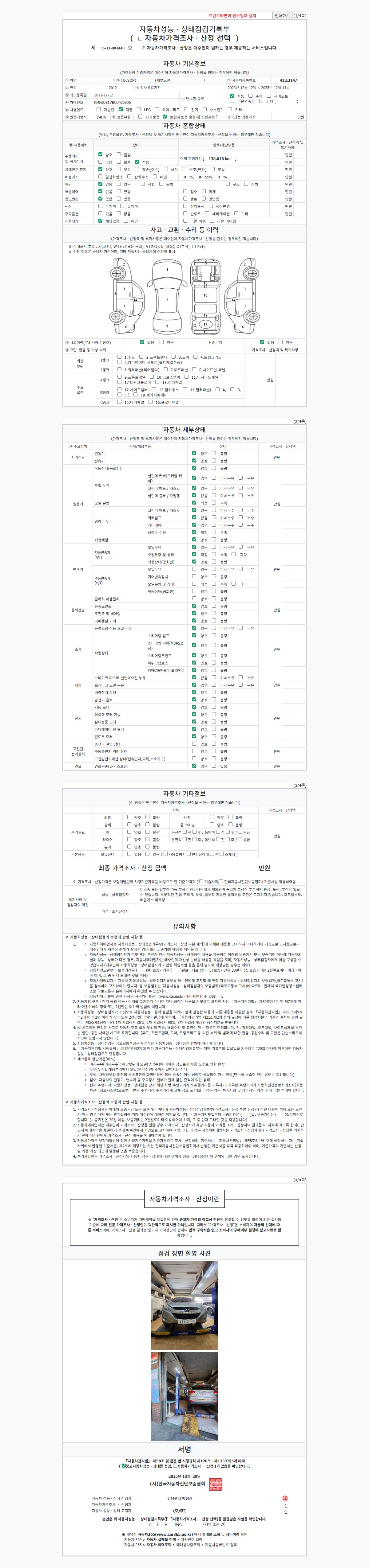 | 주행거리 | 138,616 km | 차량번호 | 41소2147 | 사고유무 | 성능기록부 참조 | 제시번호 | 제 2025145122 호 |