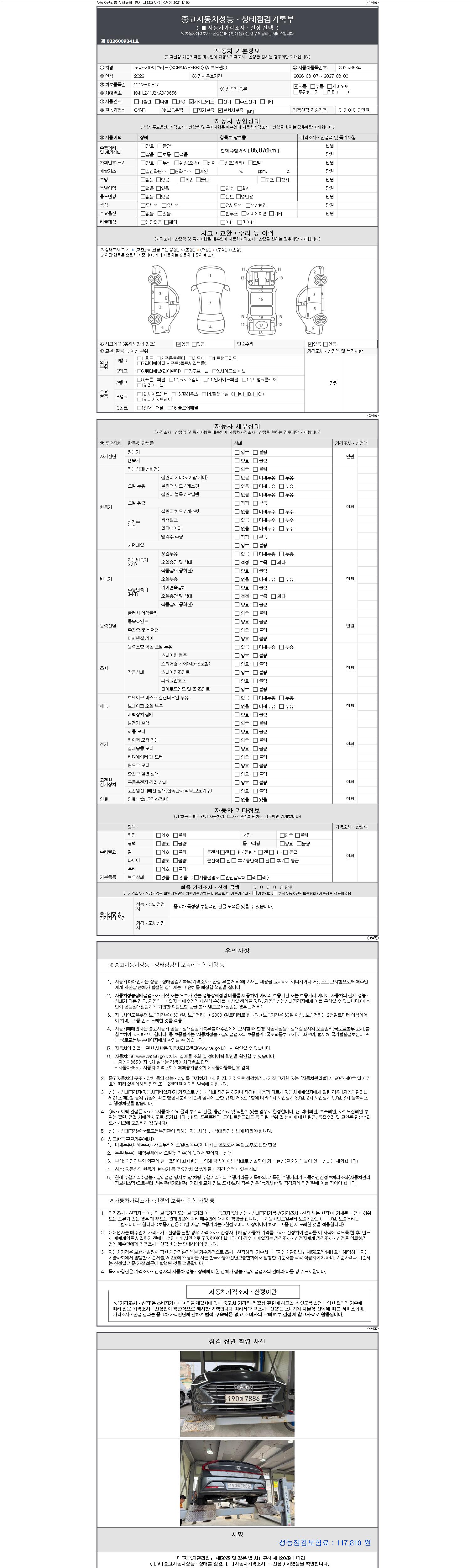 자동차관리법 시행규칙 제120조의 규정에 따라 별지 제 82호서식 《중고자동차 성능, 상태점검 기록부》를 발행한 성능, 상태점검자 및 매매자는 아래의 보증기간 또는 보증거리 이내의 중고자동차, 성능점검 기록부에 기재된 내용과 자동차의 실제 성능, 상태가 다른 경우 계약 또는 관계법령에 따라 매수인에 대하여 책임을 집니다.
