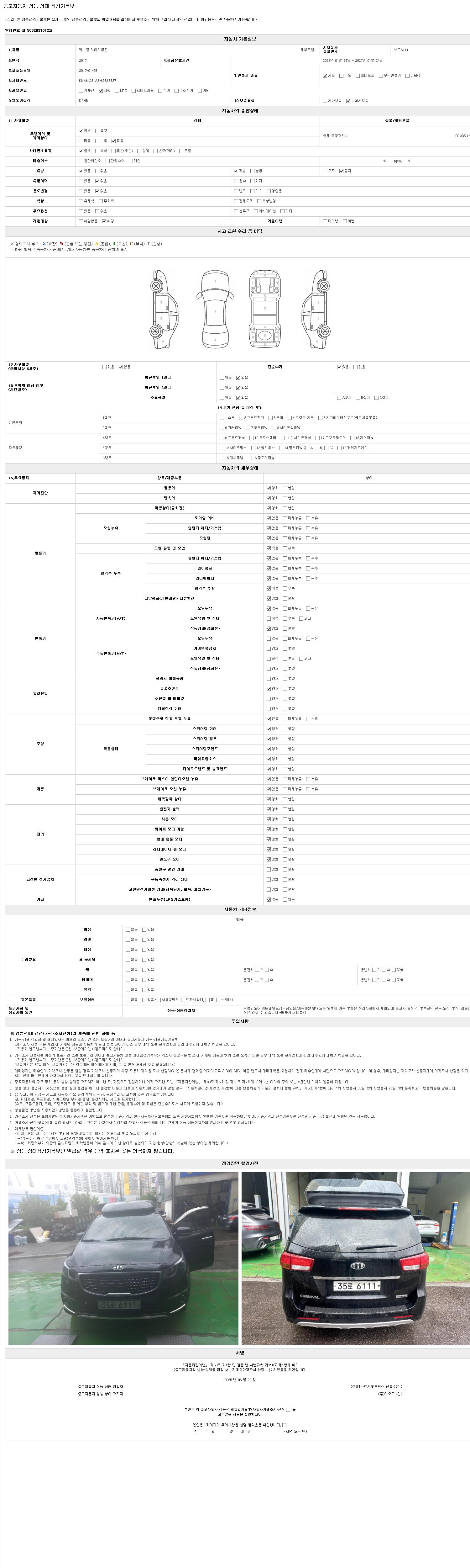 | 주행거리 | 90,000 km | 차량번호 | 35로6111 | 사고유무 | 성능기록부 참조 | 제시번호 | 제 2025020300 호 |
