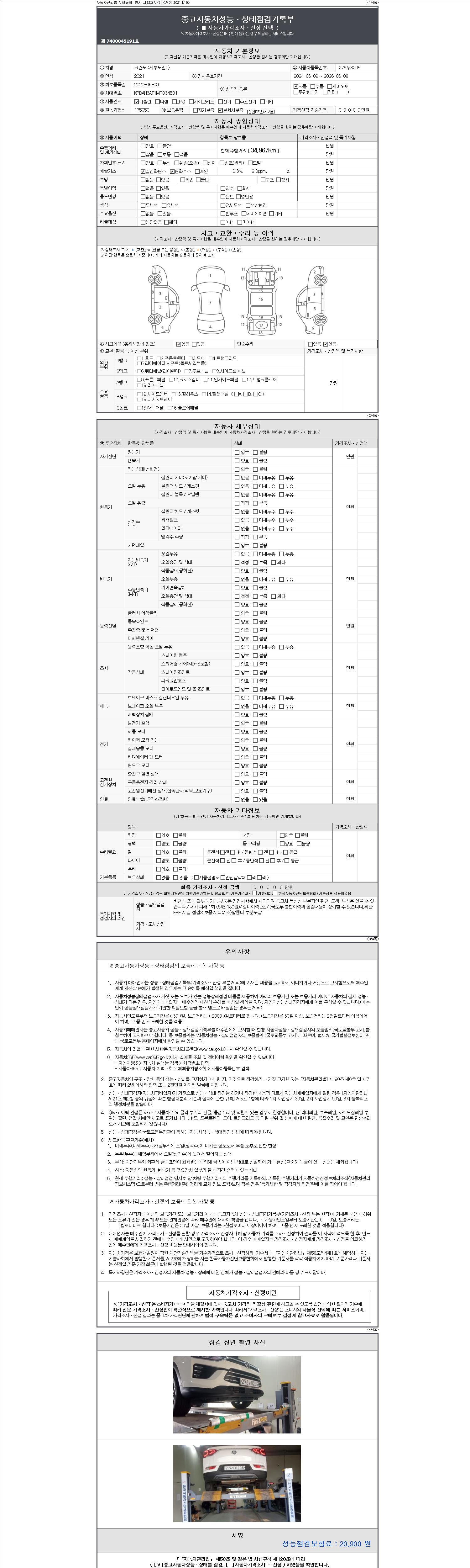 자동차관리법 시행규칙 제120조의 규정에 따라 별지 제 82호서식 《중고자동차 성능, 상태점검 기록부》를 발행한 성능, 상태점검자 및 매매자는 아래의 보증기간 또는 보증거리 이내의 중고자동차, 성능점검 기록부에 기재된 내용과 자동차의 실제 성능, 상태가 다른 경우 계약 또는 관계법령에 따라 매수인에 대하여 책임을 집니다.