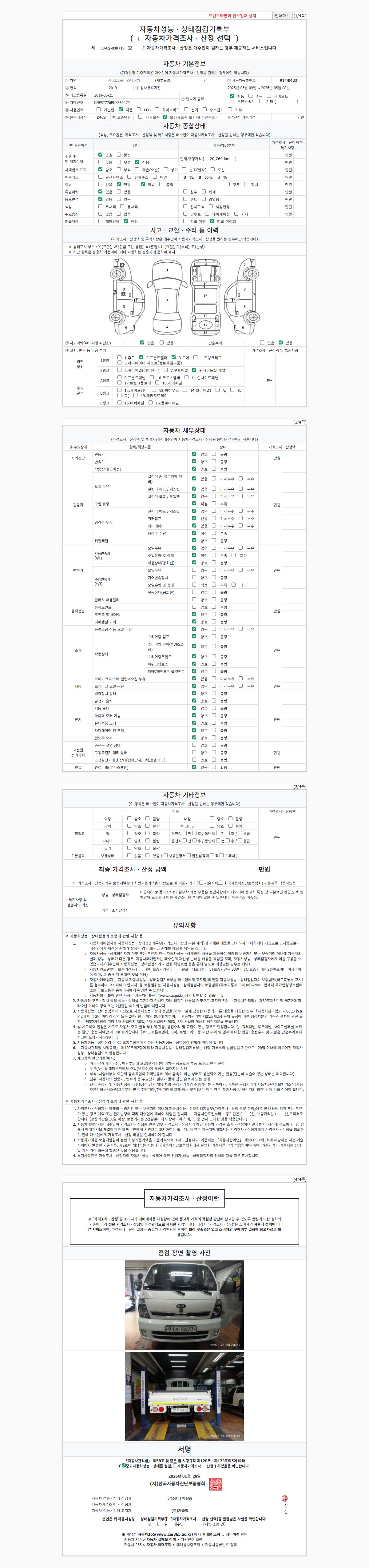 | 주행거리 | 70,769 km | 차량번호 | 91가0423 | 사고유무 | 성능기록부 참조 | 제시번호 | 제 2026005588 호 |