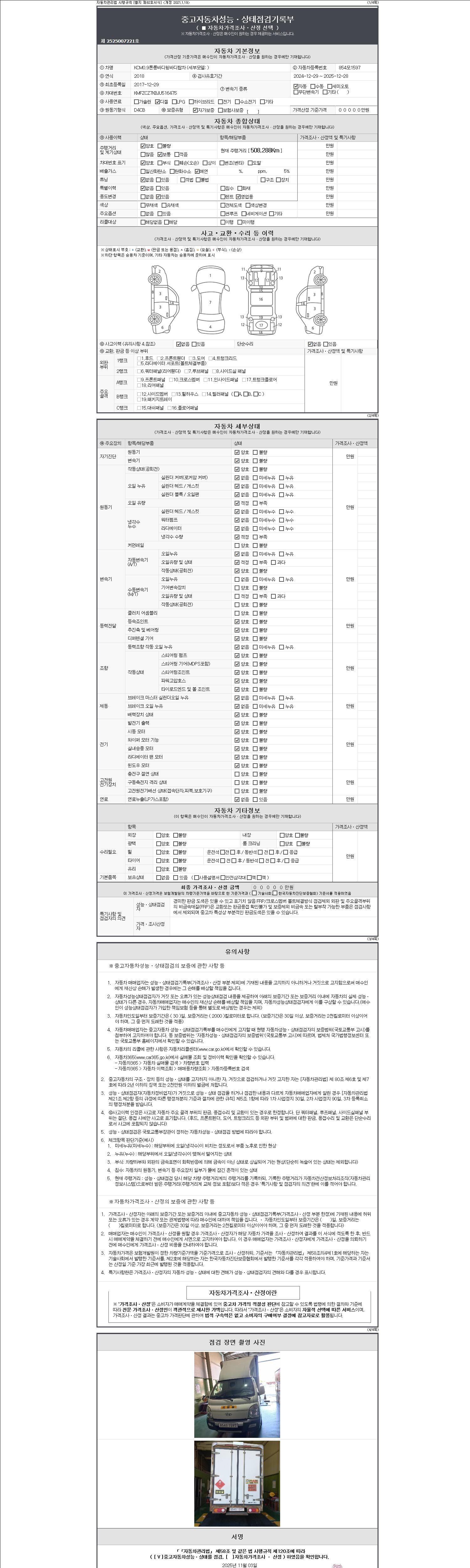 자동차관리법 시행규칙 제120조의 규정에 따라 별지 제 82호서식 《중고자동차 성능, 상태점검 기록부》를 발행한 성능, 상태점검자 및 매매자는 아래의 보증기간 또는 보증거리 이내의 중고자동차, 성능점검 기록부에 기재된 내용과 자동차의 실제 성능, 상태가 다른 경우 계약 또는 관계법령에 따라 매수인에 대하여 책임을 집니다.