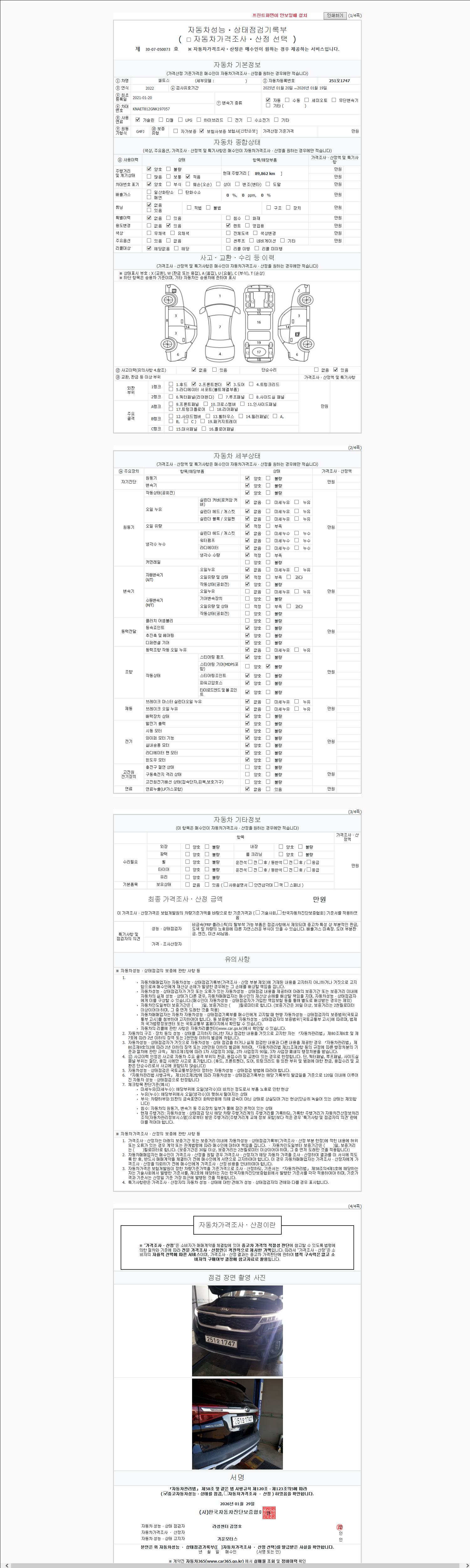 | 주행거리 | 89,800 km | 차량번호 | 251오1747 | 사고유무 | 성능기록부 참조 | 제시번호 | 제 2147483647 호 |