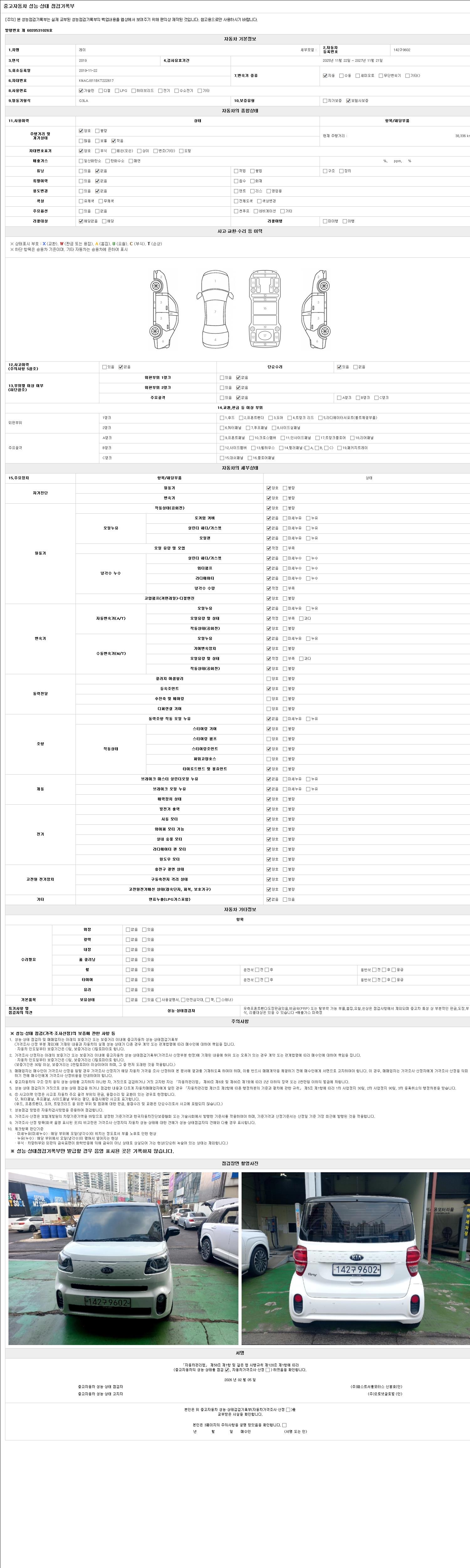| 주행거리 | 38,336 km | 차량번호 | 142구9602 | 사고유무 | 성능기록부 참조 | 제시번호 | 제 2026003966 호 |