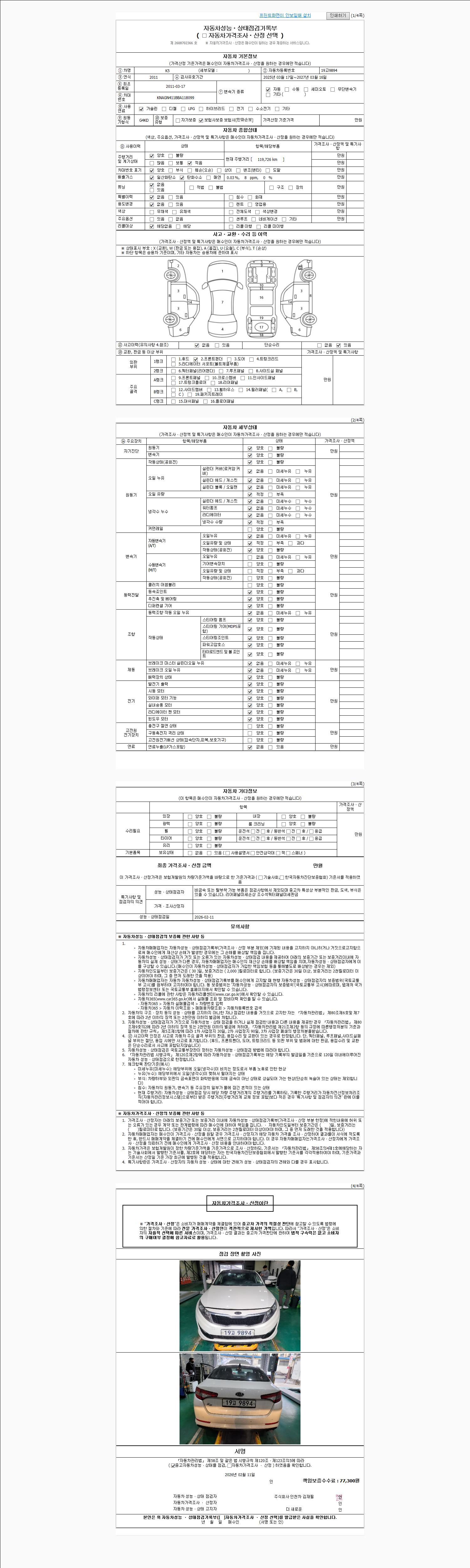 | 주행거리 | 119,715 km | 차량번호 | 19고9894 | 사고유무 | 성능기록부 참조 | 제시번호 | 제 2026006852 호 |