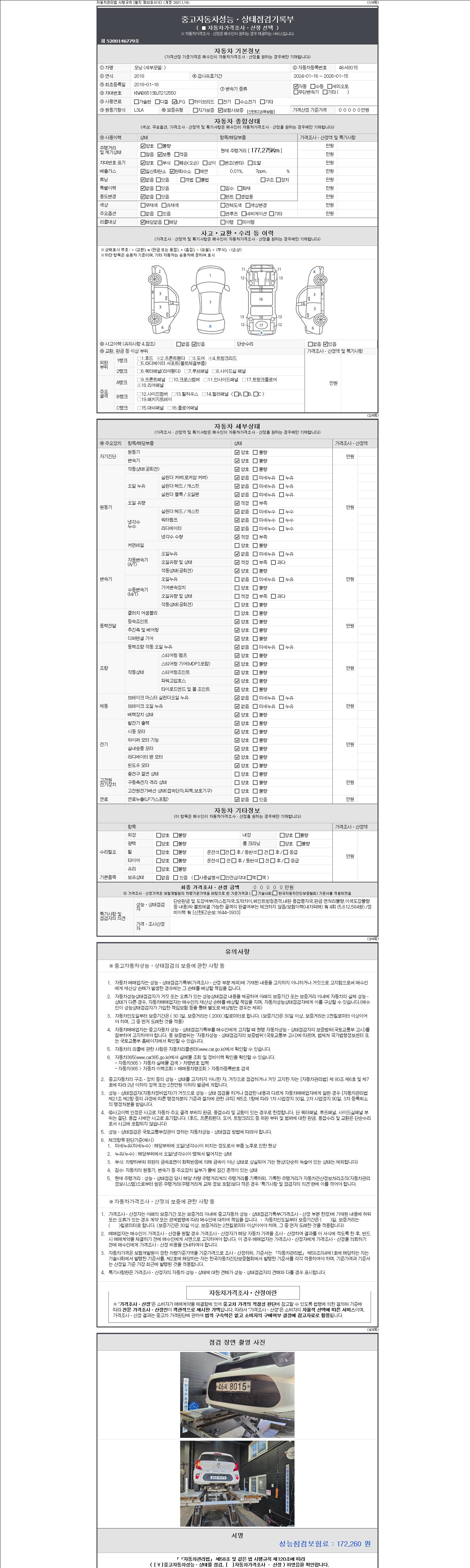 | 주행거리 | 177,272 km | 차량번호 | 46서8015 | 사고유무 | 성능기록부 참조 | 제시번호 | 제 2147483647 호 |