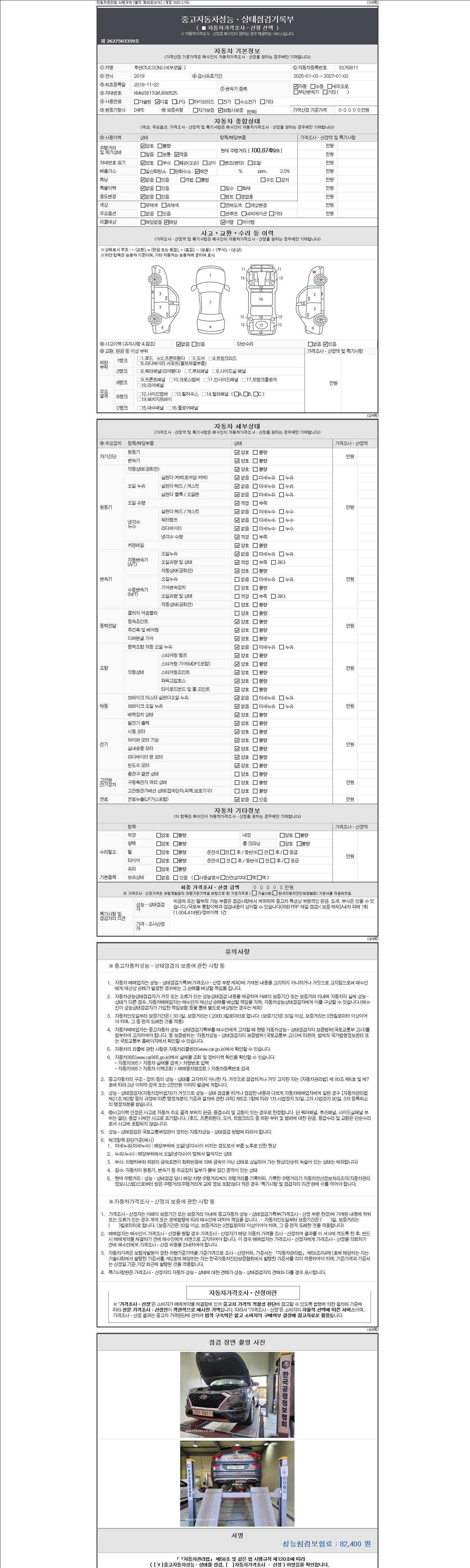 자동차관리법 시행규칙 제120조의 규정에 따라 별지 제 82호서식 《중고자동차 성능, 상태점검 기록부》를 발행한 성능, 상태점검자 및 매매자는 아래의 보증기간 또는 보증거리 이내의 중고자동차, 성능점검 기록부에 기재된 내용과 자동차의 실제 성능, 상태가 다른 경우 계약 또는 관계법령에 따라 매수인에 대하여 책임을 집니다.