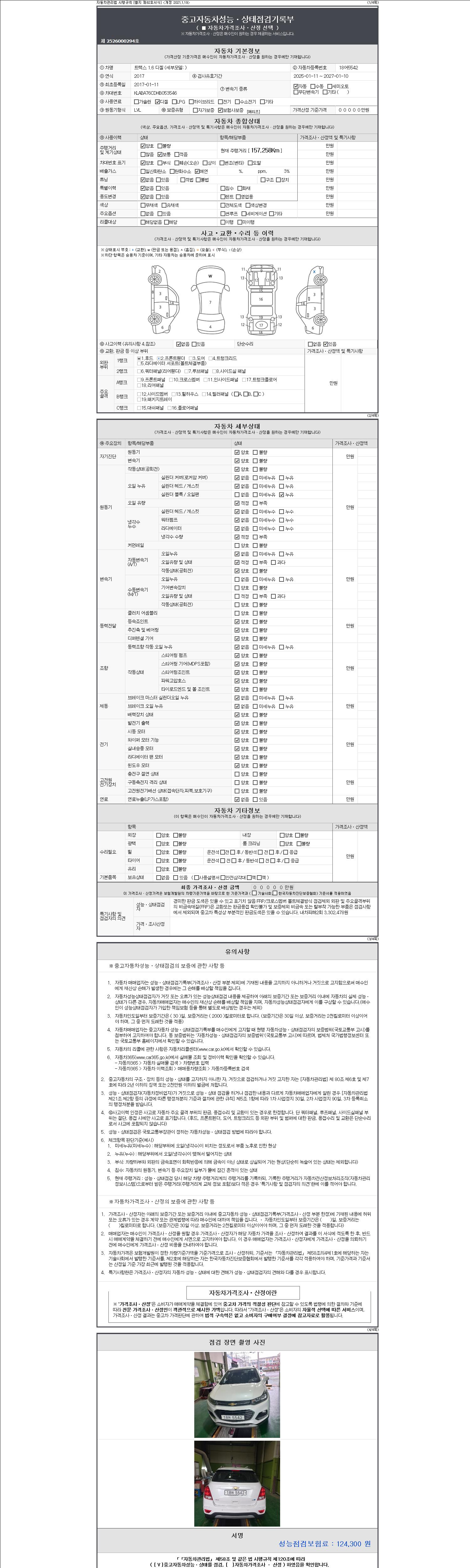 자동차관리법 시행규칙 제120조의 규정에 따라 별지 제 82호서식 《중고자동차 성능, 상태점검 기록부》를 발행한 성능, 상태점검자 및 매매자는 아래의 보증기간 또는 보증거리 이내의 중고자동차, 성능점검 기록부에 기재된 내용과 자동차의 실제 성능, 상태가 다른 경우 계약 또는 관계법령에 따라 매수인에 대하여 책임을 집니다.