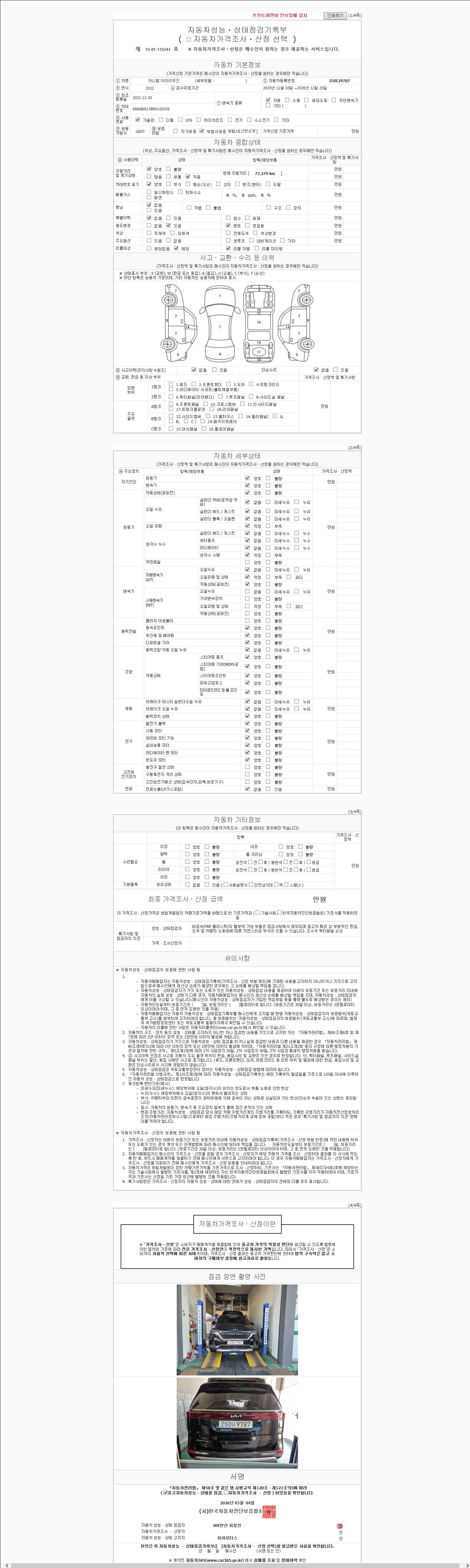 | 주행거리 | 77,279 km | 차량번호 | 250나9787 | 사고유무 | 성능기록부 참조 | 제시번호 | 제 2147483647 호 |