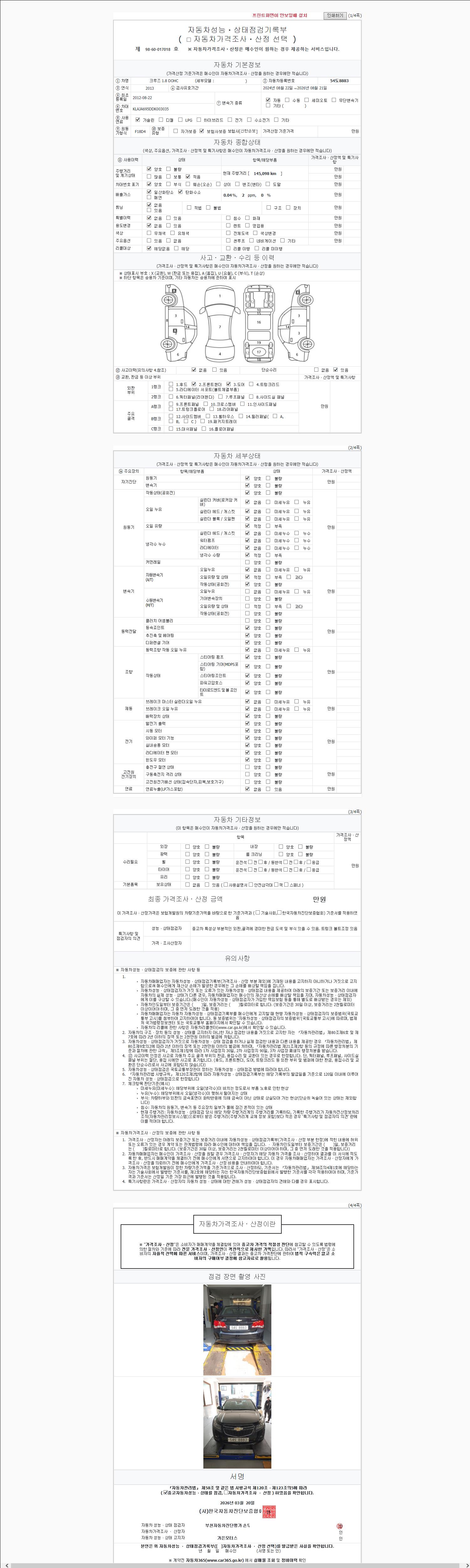 | 주행거리 | 145,095 km | 차량번호 | 54도8883 | 사고유무 | 성능기록부 참조 | 제시번호 | 제 2026047462 호 |