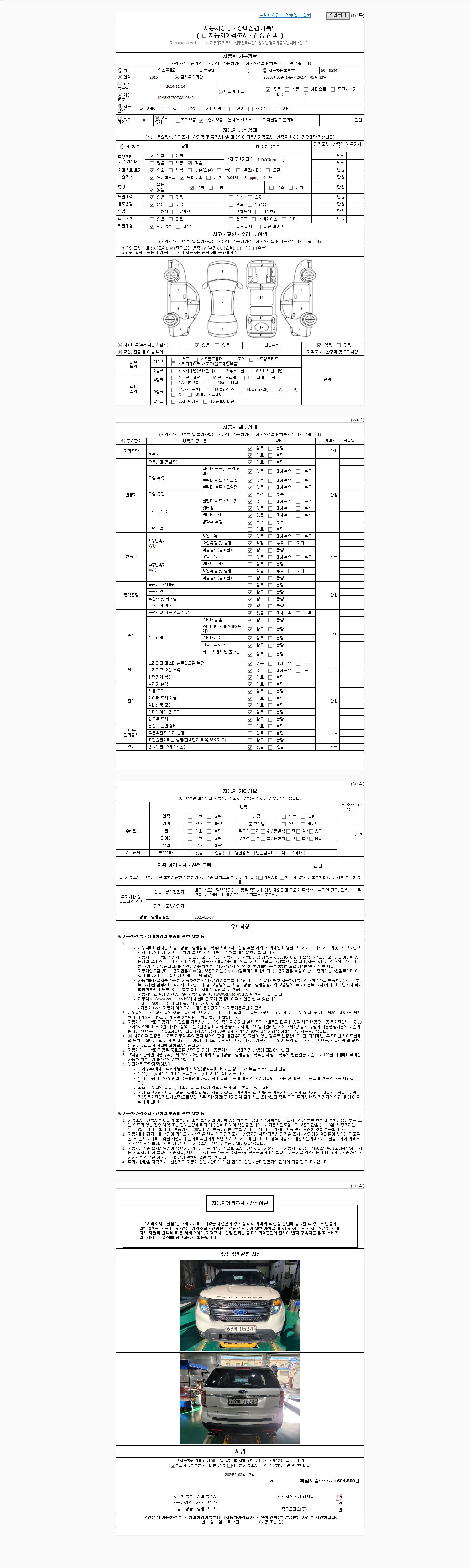 | 주행거리 | 145,516 km | 차량번호 | 69버0534 | 사고유무 | 성능기록부 참조 | 제시번호 | 제 2026013882 호 |