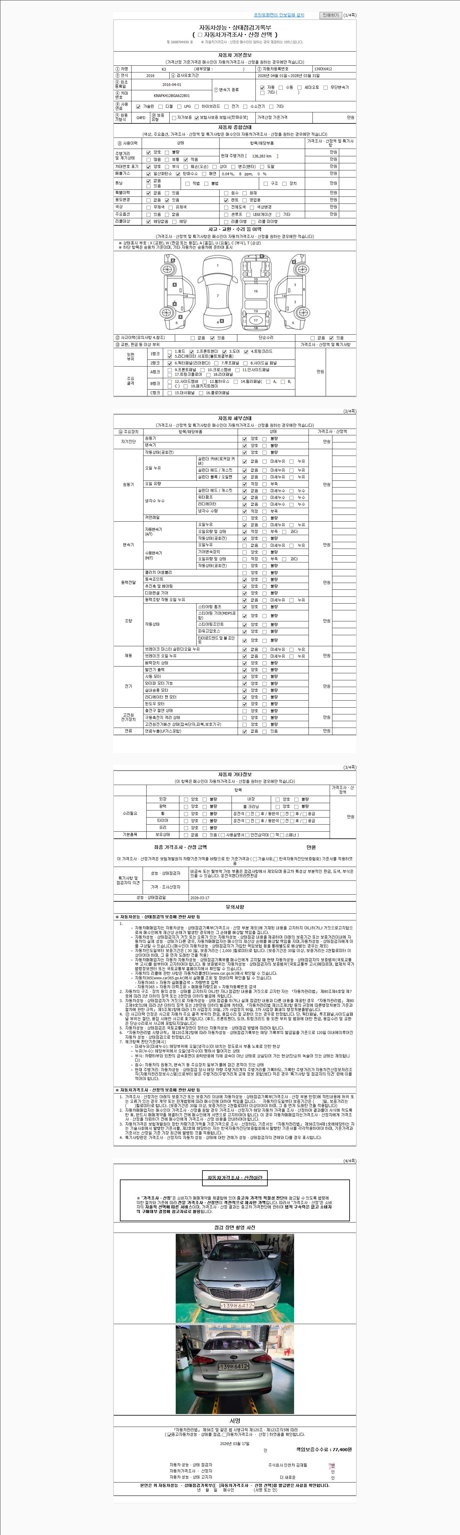 -중고자동차 매매업자를 통해 차량을 구입하실 경우 반드시 "중고자동차 성능, 상태점검 기록부"를 교뷰 받으셔야 하며, 매매업자는 반드시 의무 교부 하여야 압니다.