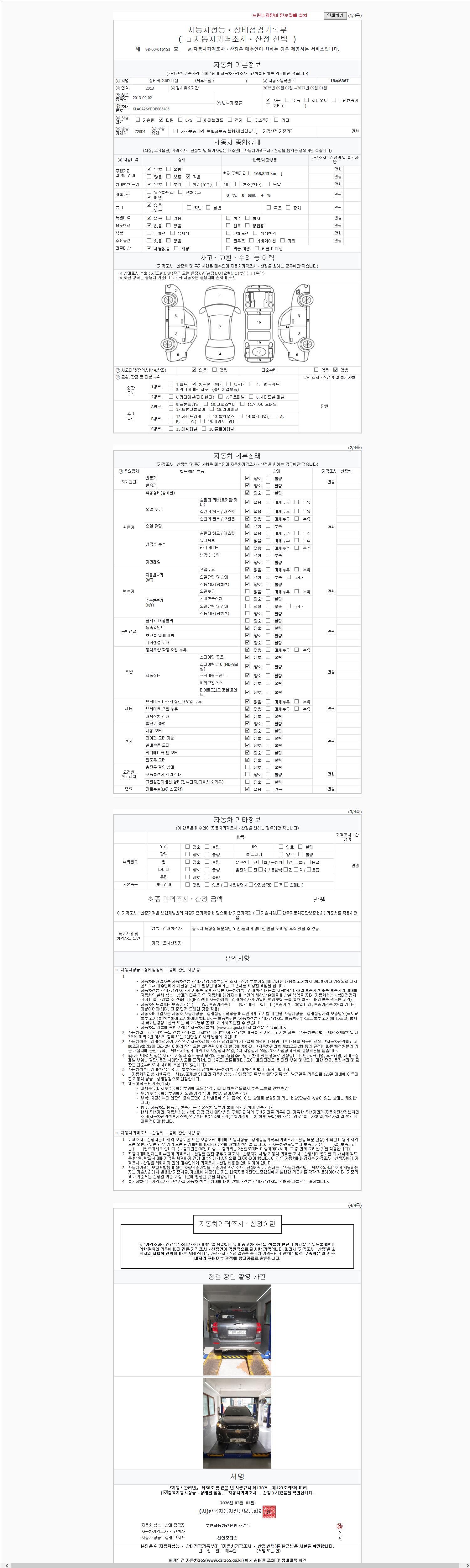 - 2. 차량 등록증이나 성능점검지 등을 상담자에게 요청및 확인하시고 사전에 미리 점검 하시기를 권유드립니다.