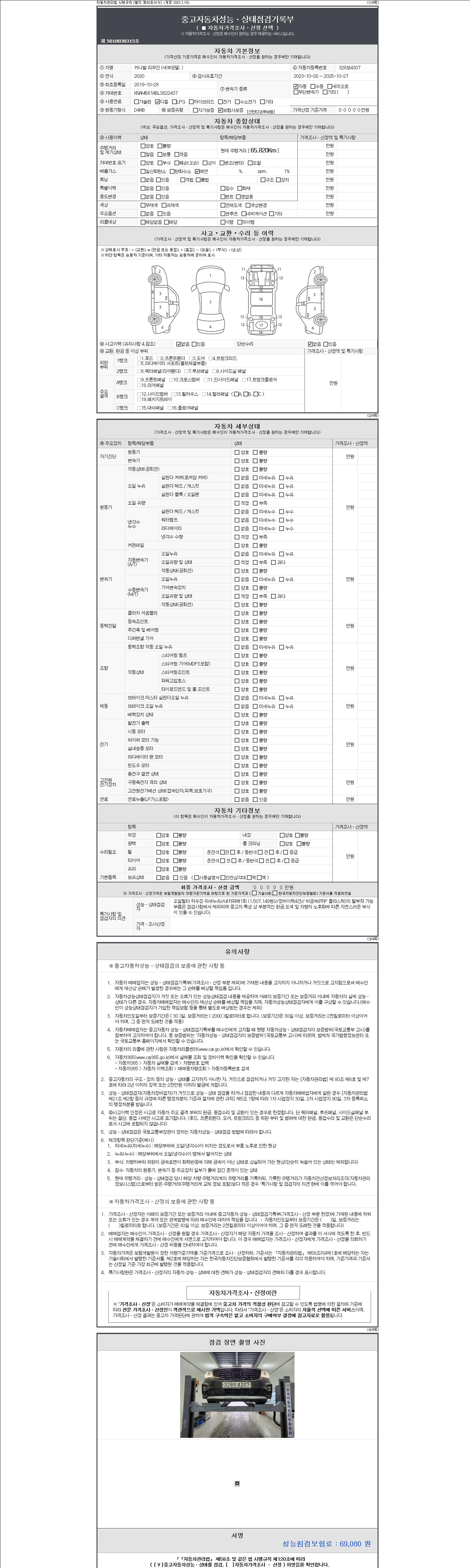 자동차관리법 시행규칙 제120조의 규정에 따라 별지 제 82호서식 《중고자동차 성능, 상태점검 기록부》를 발행한 성능, 상태점검자 및 매매자는 아래의 보증기간 또는 보증거리 이내의 중고자동차, 성능점검 기록부에 기재된 내용과 자동차의 실제 성능, 상태가 다른 경우 계약 또는 관계법령에 따라 매수인에 대하여 책임을 집니다.
