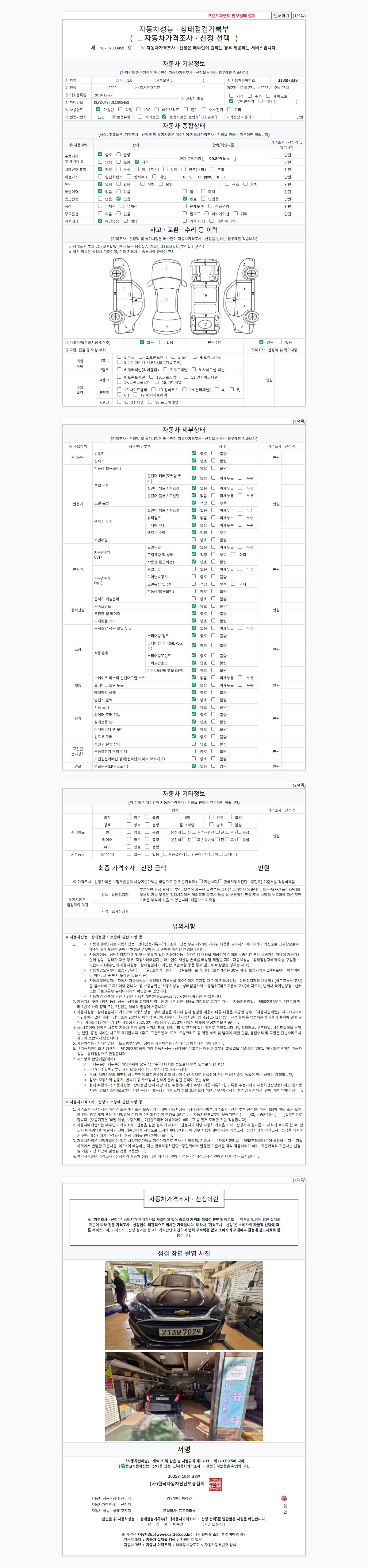 | 주행거리 | 90,900 km | 차량번호 | 213보7029 | 사고유무 | 성능기록부 참조 | 제시번호 | 제 2025145490 호 |