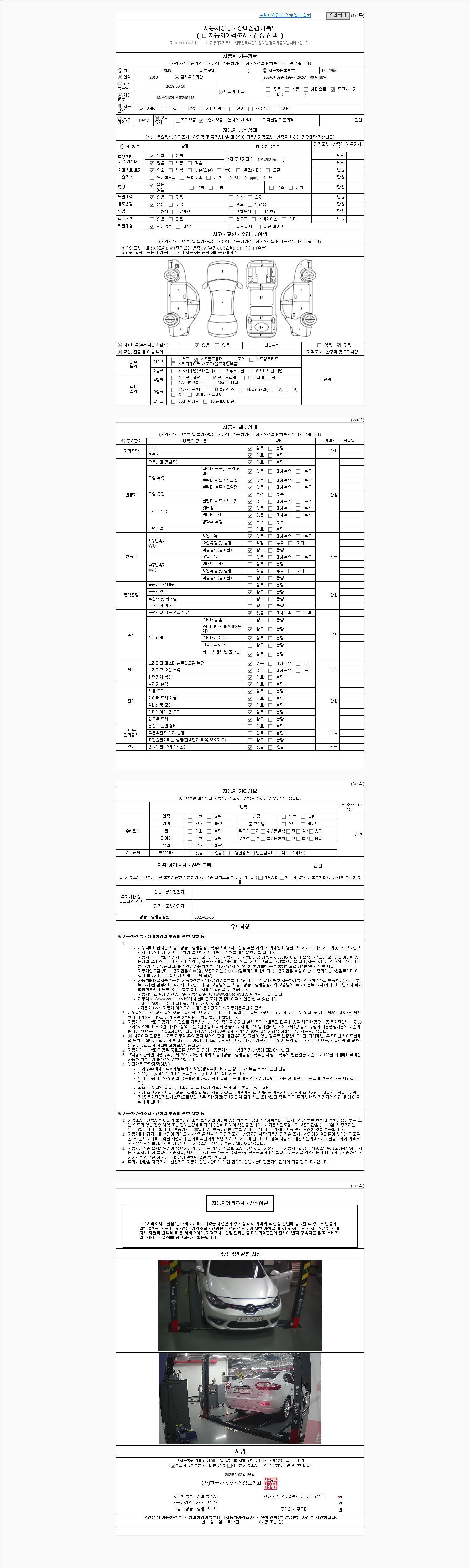 | 주행거리 | 191,202 km | 차량번호 | 47조1966 | 사고유무 | 성능기록부 참조 | 제시번호 | 제 2026037792 호 |