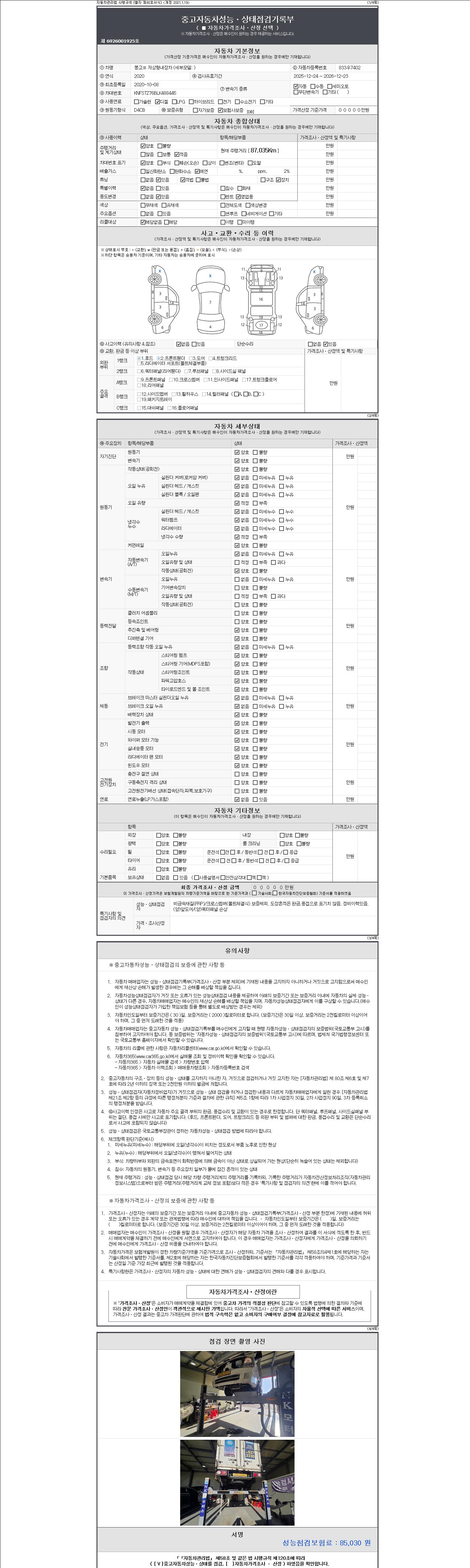 | 주행거리 | 87,035 km | 차량번호 | 833우7402 | 사고유무 | 성능기록부 참조 | 제시번호 | 제 2147483647 호 |