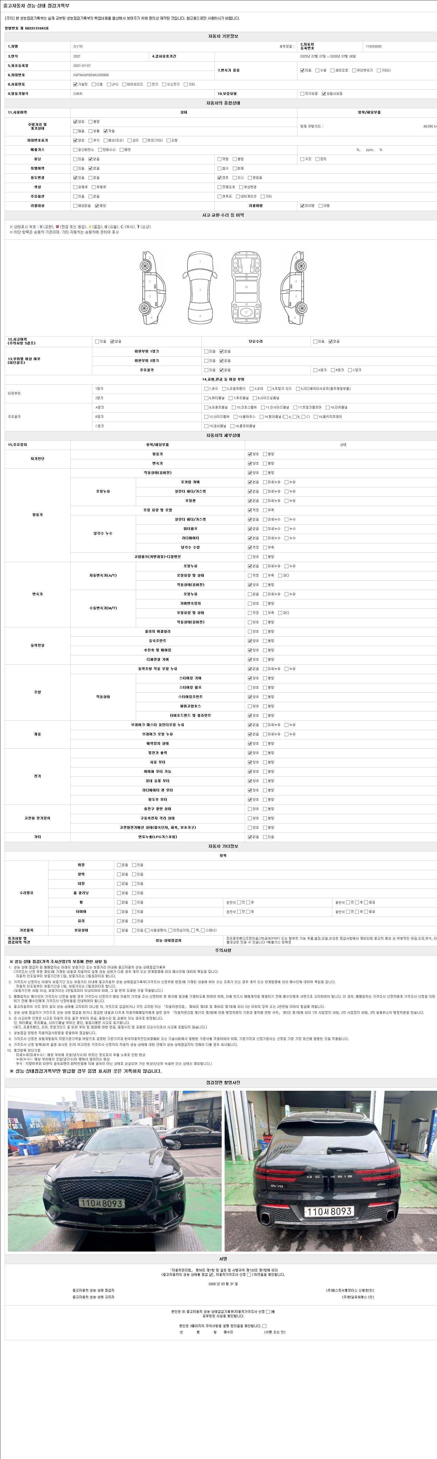 | 주행거리 | 49,585 km | 차량번호 | 110서8093 | 사고유무 | 성능기록부 참조 | 제시번호 | 제 2026010178 호 |