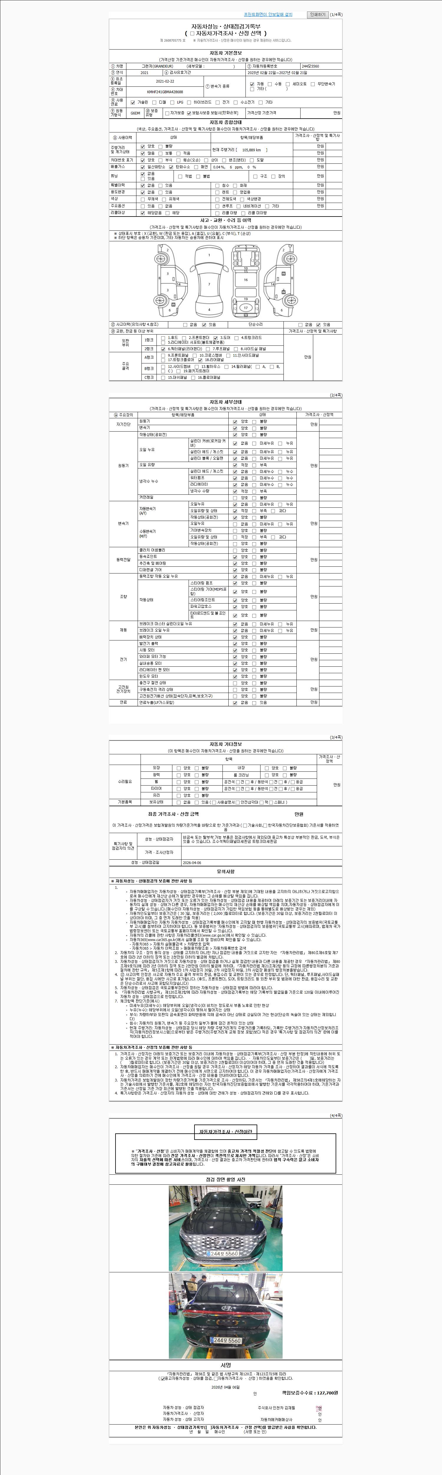 | 주행거리 | 105,889 km | 차량번호 | 244모5560 | 사고유무 | 성능기록부 참조 | 제시번호 | 제 2026016360 호 |