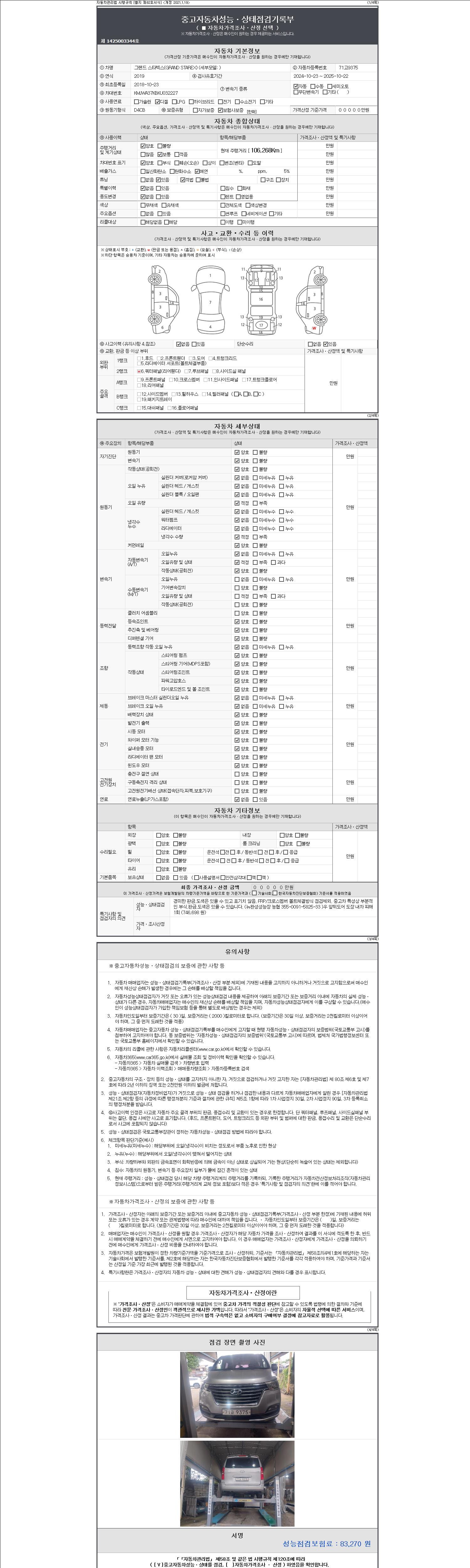 | 주행거리 | 106,268 km | 차량번호 | 71고9375 | 사고유무 | 성능기록부 참조 | 제시번호 | 제 2147483647 호 |