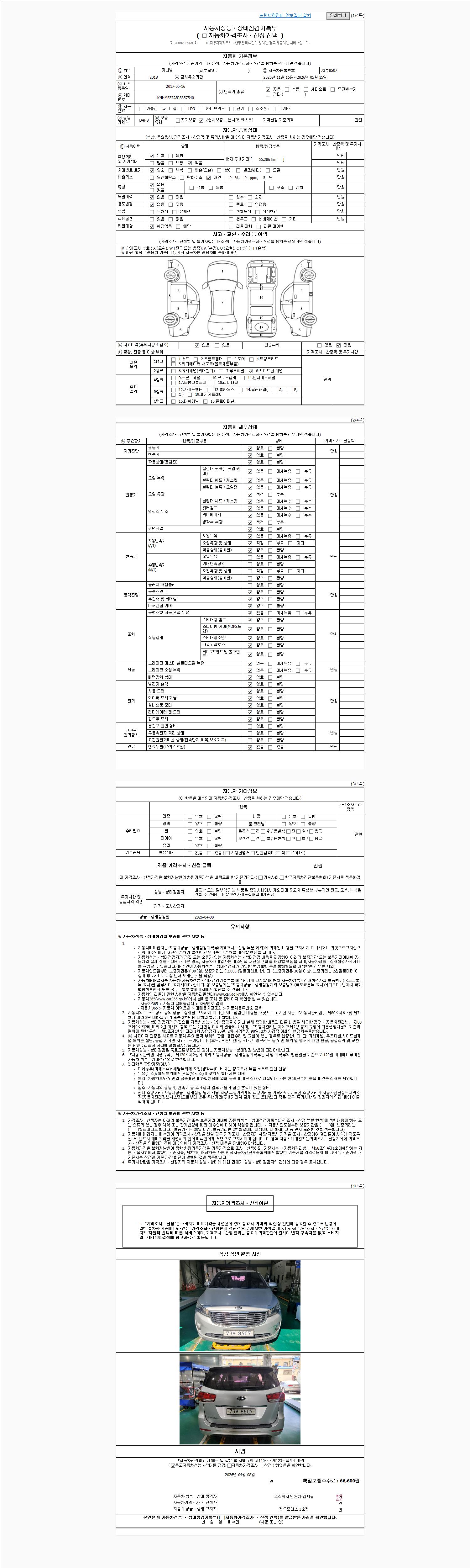 | 주행거리 | 66,286 km | 차량번호 | 73루8507 | 사고유무 | 성능기록부 참조 | 제시번호 | 제 2026018237 호 |