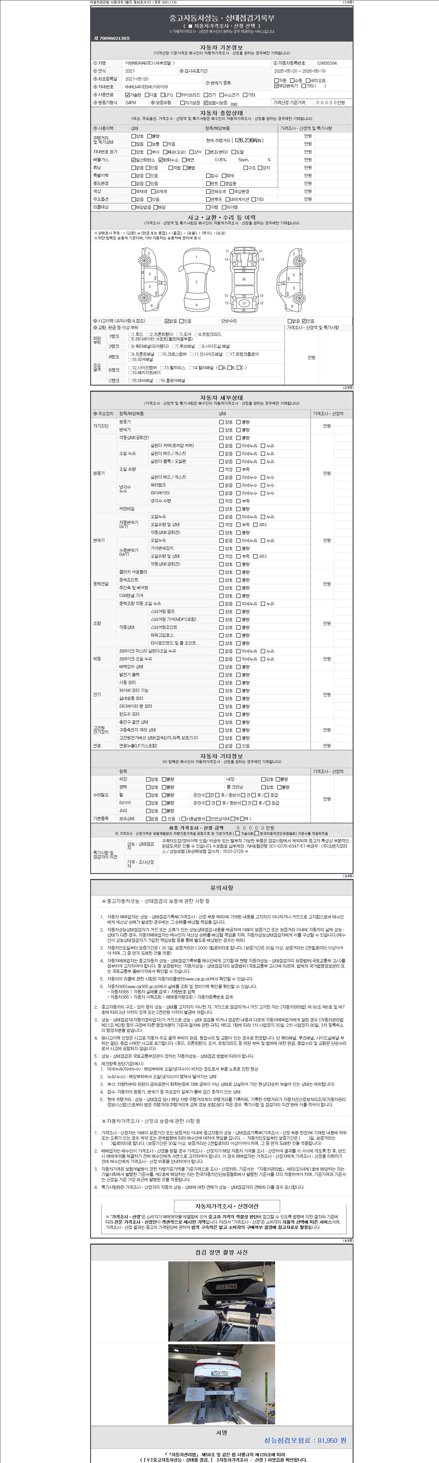 자동차관리법 시행규칙 제120조의 규정에 따라 별지 제 82호서식 《중고자동차 성능, 상태점검 기록부》를 발행한 성능, 상태점검자 및 매매자는 아래의 보증기간 또는 보증거리 이내의 중고자동차, 성능점검 기록부에 기재된 내용과 자동차의 실제 성능, 상태가 다른 경우 계약 또는 관계법령에 따라 매수인에 대하여 책임을 집니다.