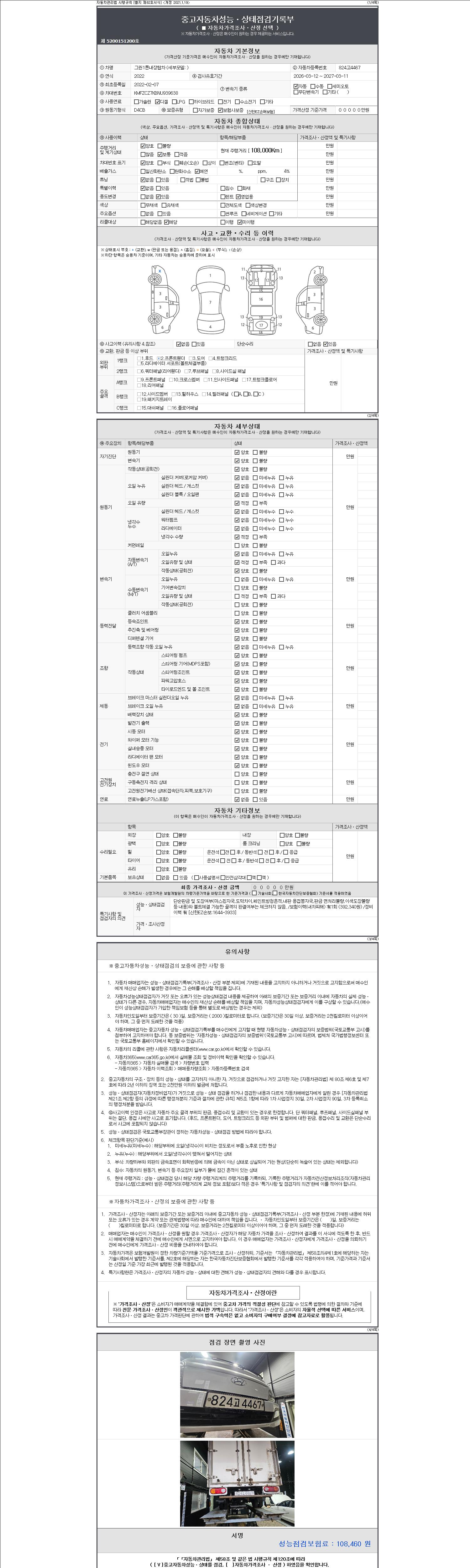 | 주행거리 | 108,000 km | 차량번호 | 824고4467 | 사고유무 | 성능기록부 참조 | 제시번호 | 제 2147483647 호 |