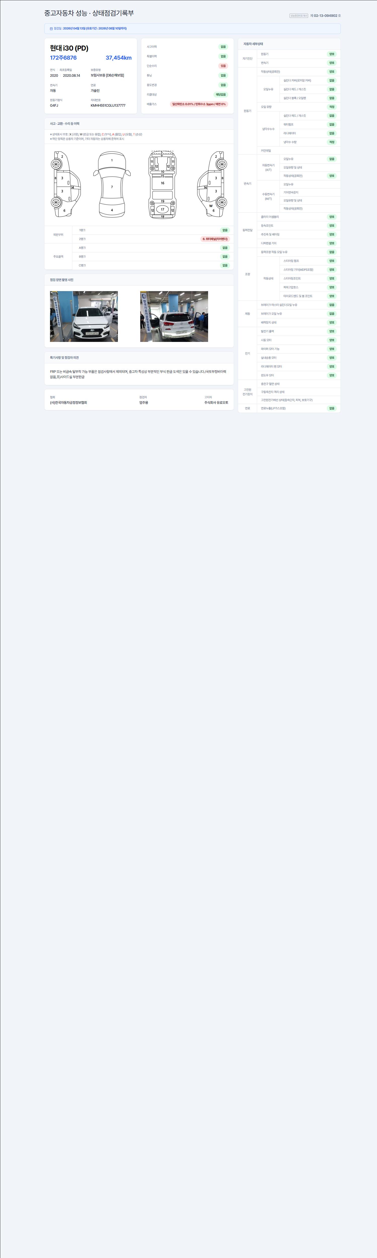 | 주행거리 | 37,523 km | 차량번호 | 172주6876 | 사고유무 | 성능기록부 참조 | 제시번호 | 제 2026067427 호 |