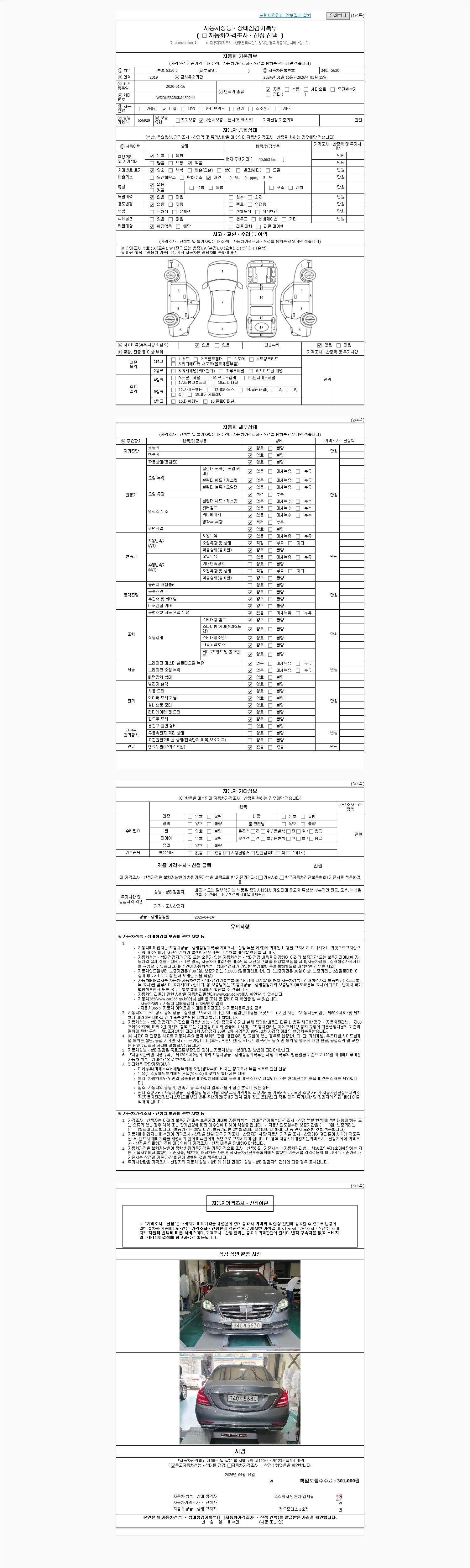 | 주행거리 | 45,663 km | 차량번호 | 340거5630 | 사고유무 | 성능기록부 참조 | 제시번호 | 제 2026019373 호 |