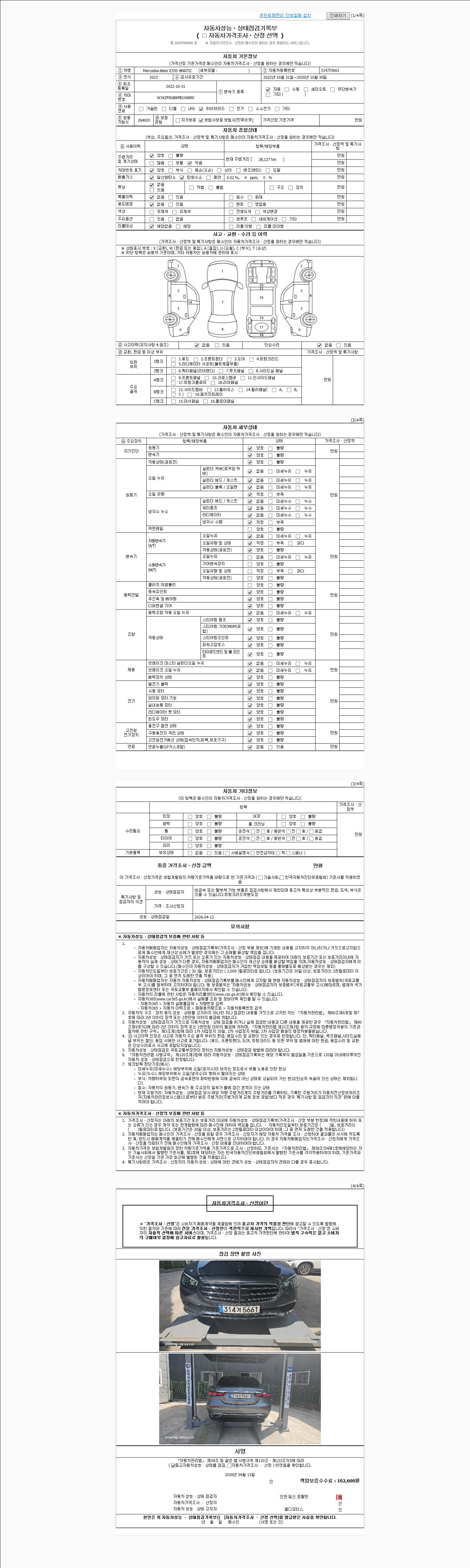 자동차관리법 시행규칙 제120조의 규정에 따라 별지 제 82호서식 《중고자동차 성능, 상태점검 기록부》를 발행한 성능, 상태점검자 및 매매자는 아래의 보증기간 또는 보증거리 이내의 중고자동차, 성능점검 기록부에 기재된 내용과 자동차의 실제 성능, 상태가 다른 경우 계약 또는 관계법령에 따라 매수인에 대하여 책임을 집니다.