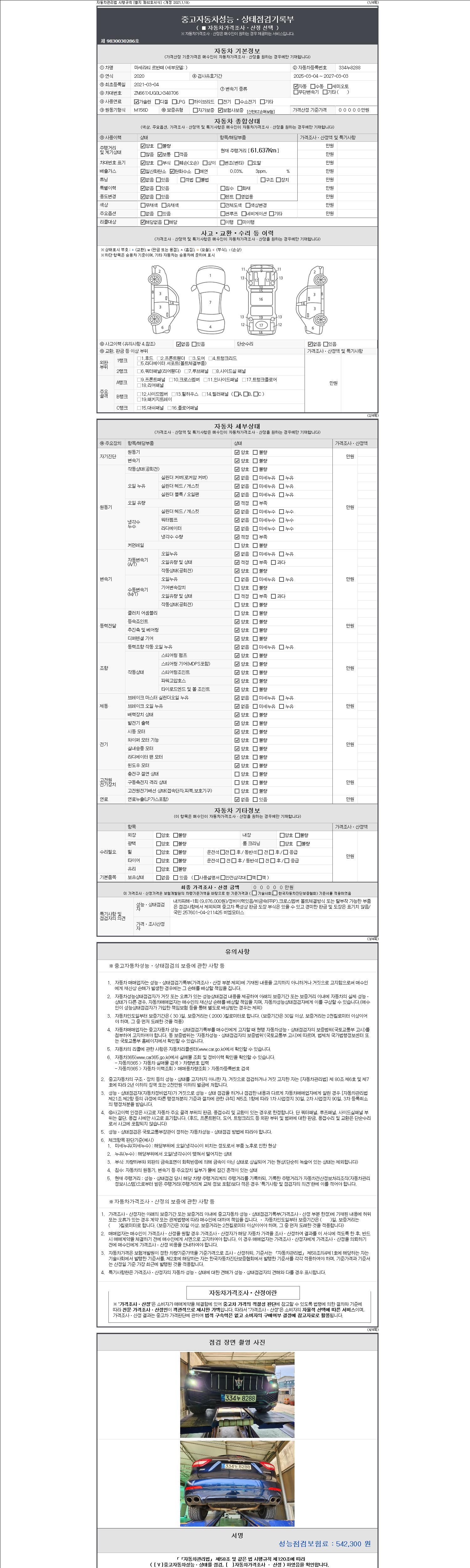 | 주행거리 | 61,637 km | 차량번호 | 334누8288 | 사고유무 | 성능기록부 참조 | 제시번호 | 제 2147483647 호 |