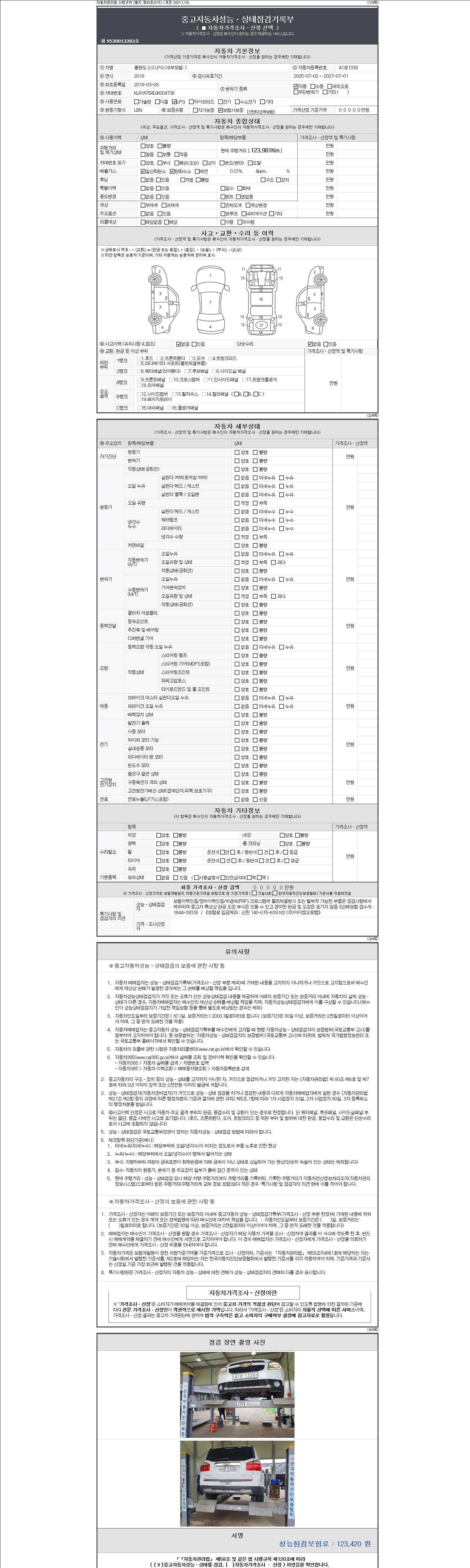 | 주행거리 | 123,981 km | 차량번호 | 41로1338 | 사고유무 | 성능기록부 참조 | 제시번호 | 제 2147483647 호 |