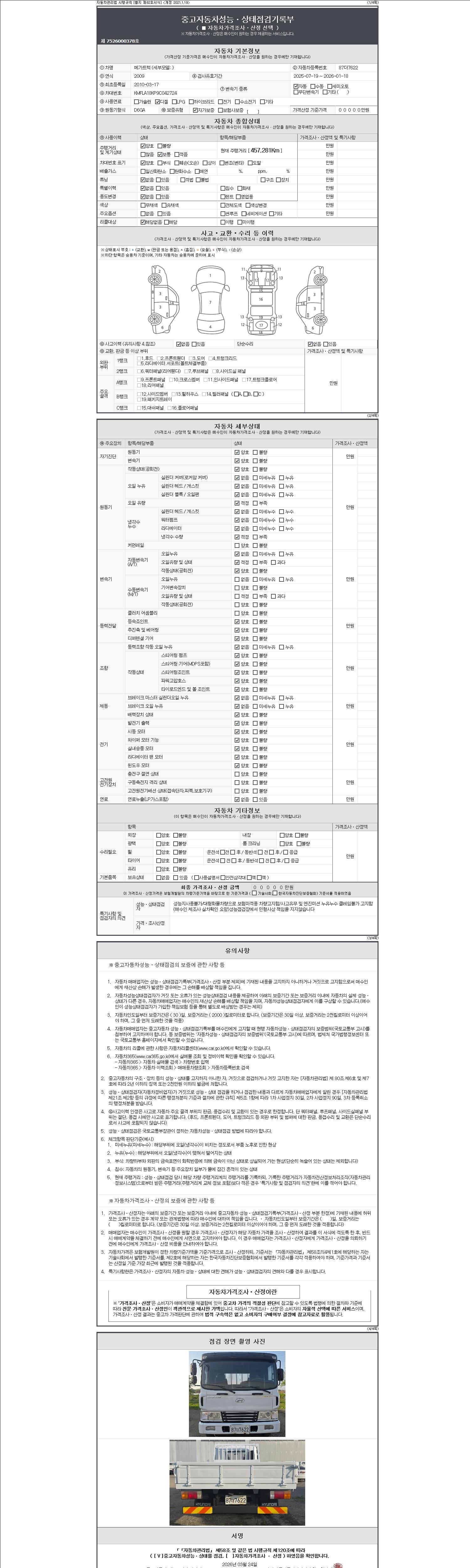 | 주행거리 | 456,594 km | 차량번호 | 87더7622 | 사고유무 | 성능기록부 참조 | 제시번호 | 제 2147483647 호 |