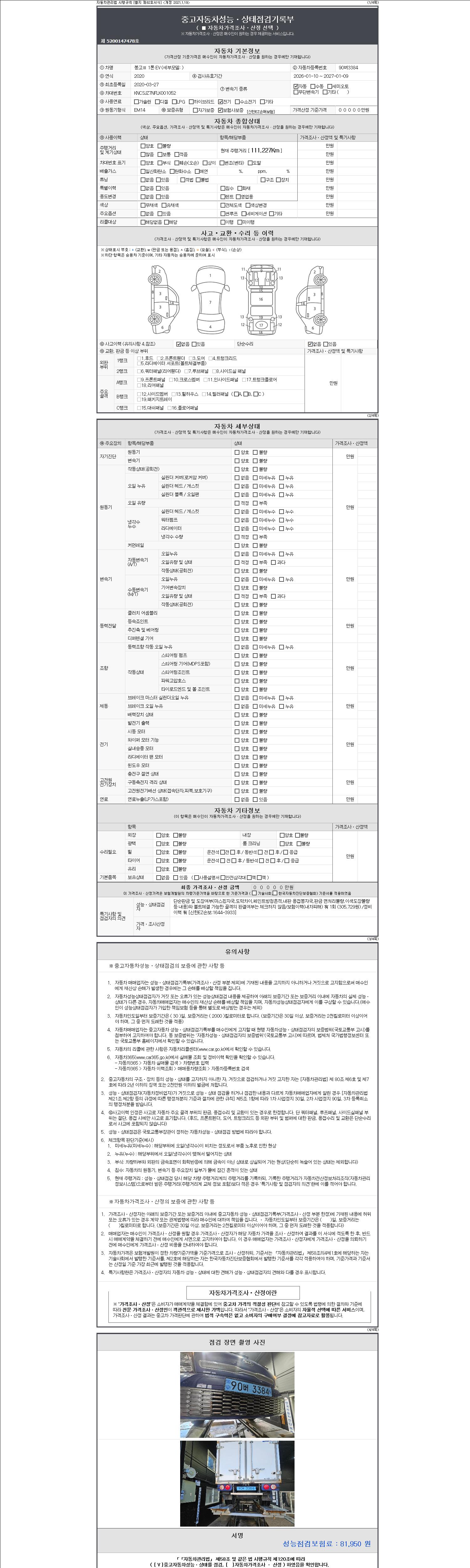 | 주행거리 | 111,227 km | 차량번호 | 90버3384 | 사고유무 | 성능기록부 참조 | 제시번호 | 제 2147483647 호 |
