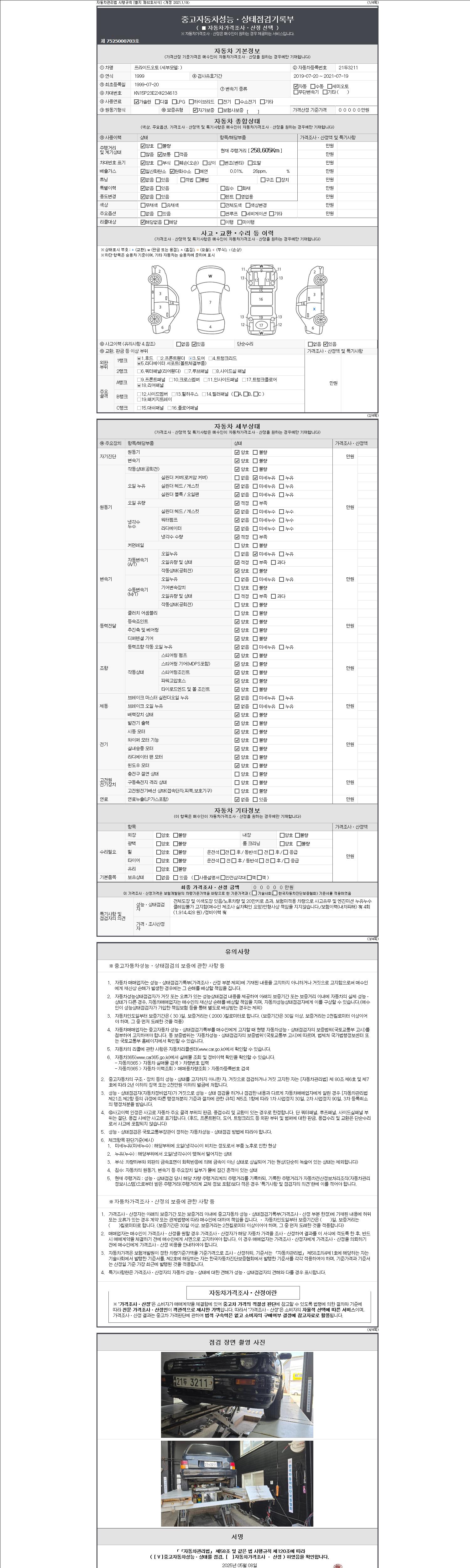 -중고자동차 매매업자를 통해 차량을 구입하실 경우 반드시 "중고자동차 성능, 상태점검 기록부"를 교뷰 받으셔야 하며, 매매업자는 반드시 의무 교부 하여야 압니다.