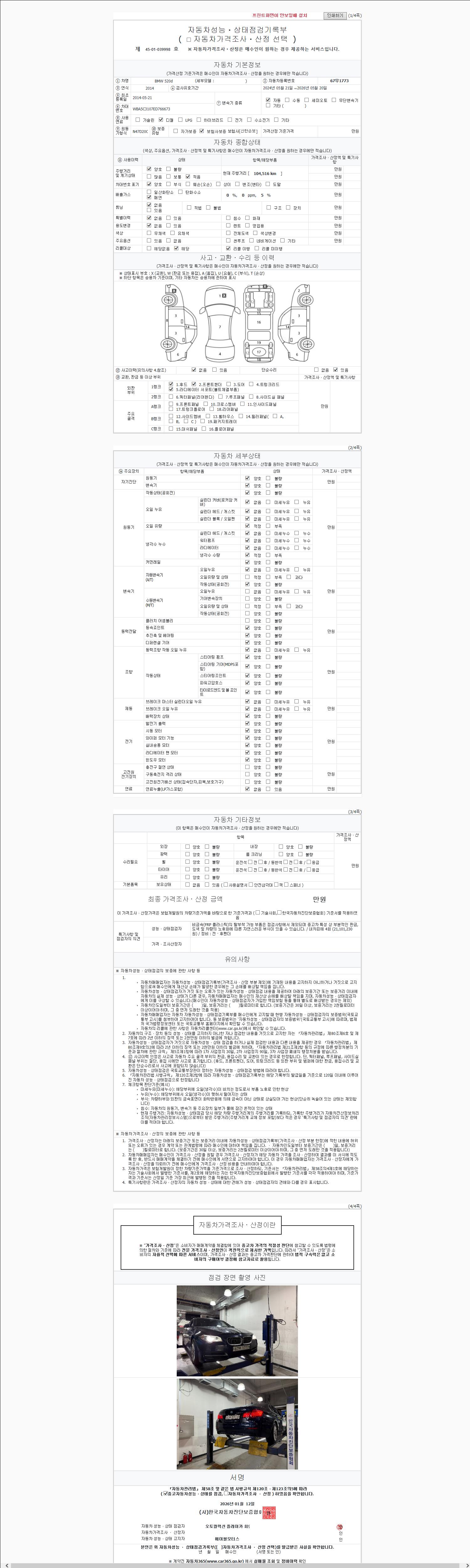 | 주행거리 | 104,516 km | 차량번호 | 67무1773 | 사고유무 | 성능기록부 참조 | 제시번호 | 제 2147483647 호 |