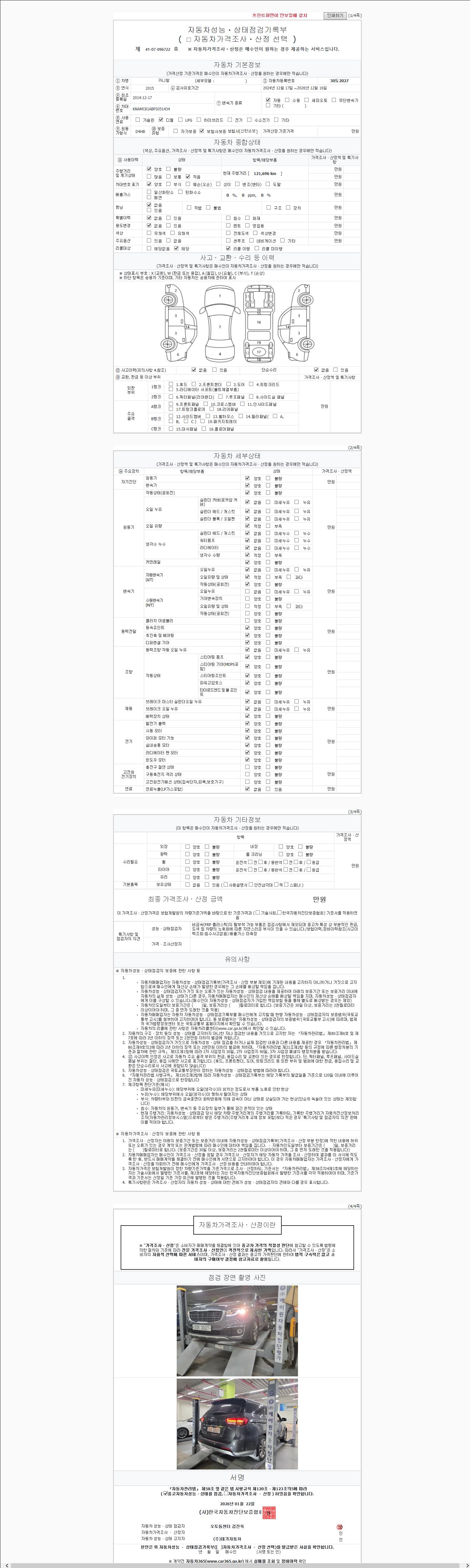 | 주행거리 | 121,687 km | 차량번호 | 30도2027 | 사고유무 | 성능기록부 참조 | 제시번호 | 제 2147483647 호 |