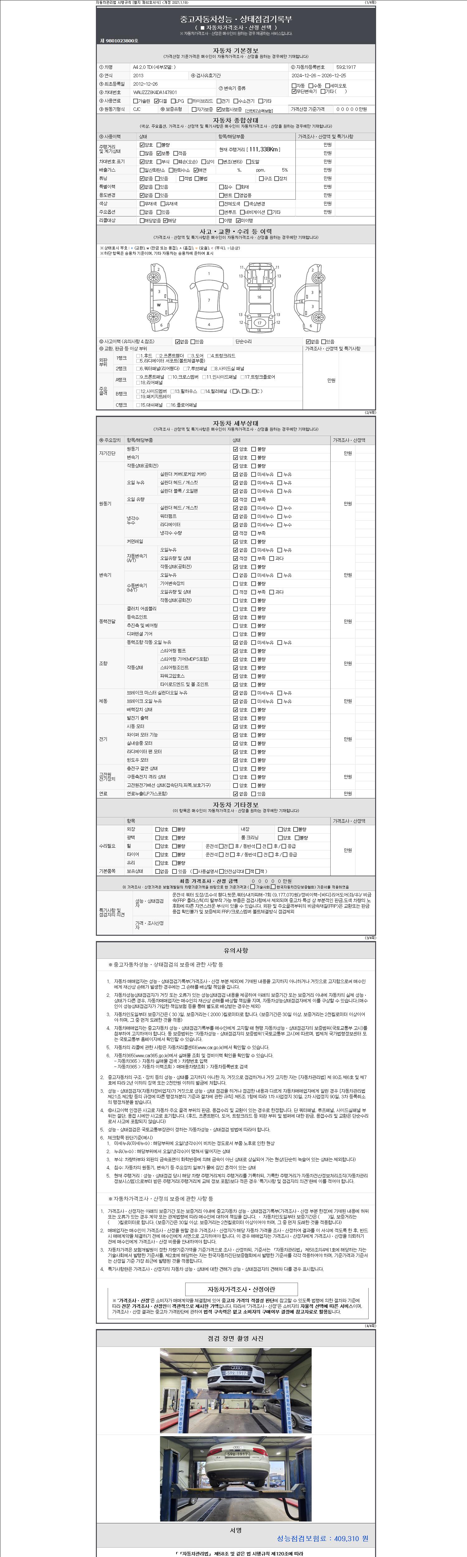 -중고자동차 매매업자를 통해 차량을 구입하실 경우 반드시 "중고자동차 성능, 상태점검 기록부"를 교뷰 받으셔야 하며, 매매업자는 반드시 의무 교부 하여야 압니다.
